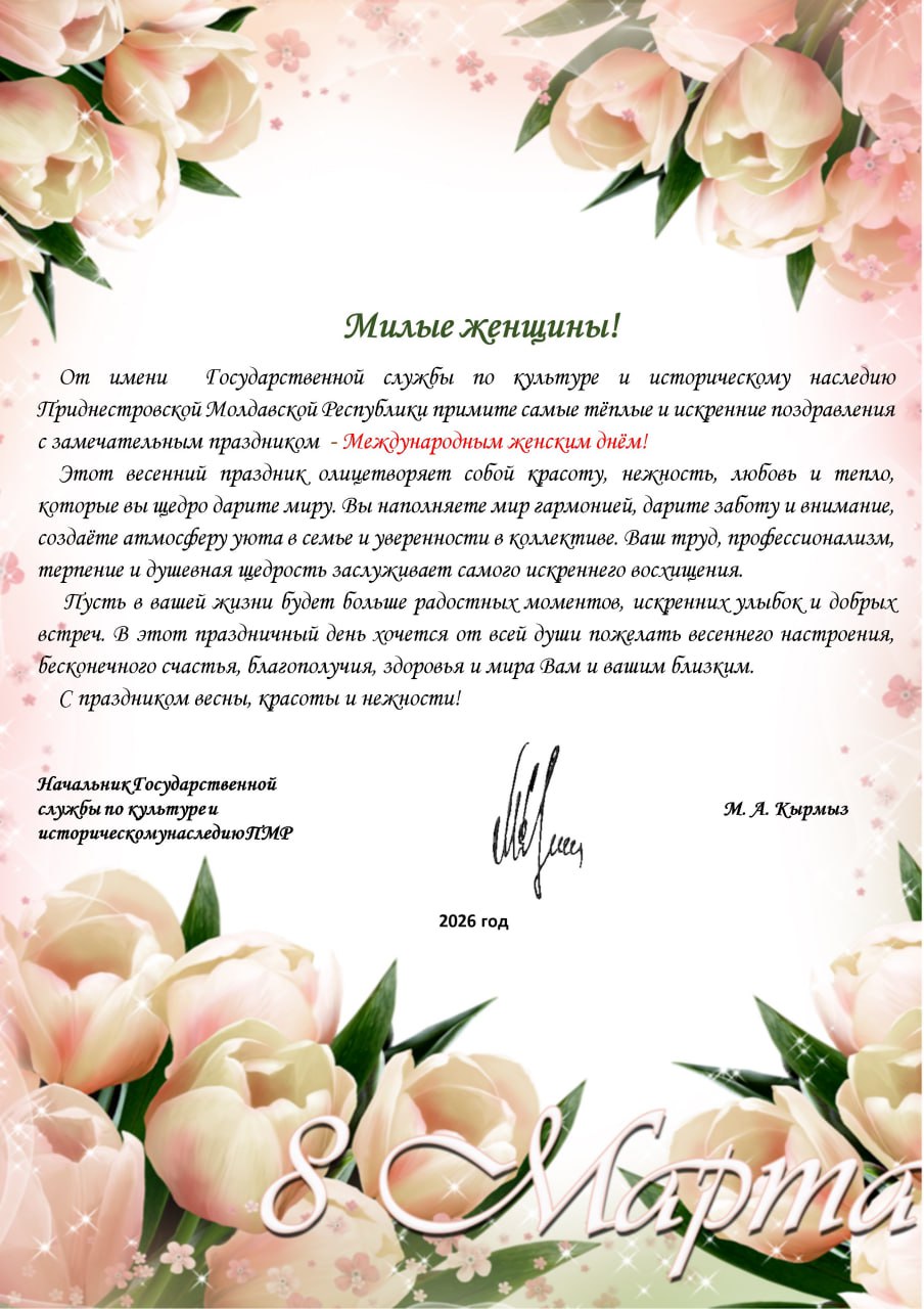 ПОЗДРАВЛЕНИЕ НАЧАЛЬНИКА ГОСУДАРСТВЕННОЙ СЛУЖБЫ ПО КУЛЬТУРЕ И ИСТОРИЧЕСКОМУ НАСЛЕДИЮ ПМР С МЕЖДУНАРОДНЫМ ЖЕНСКИМ ДНЁМ!