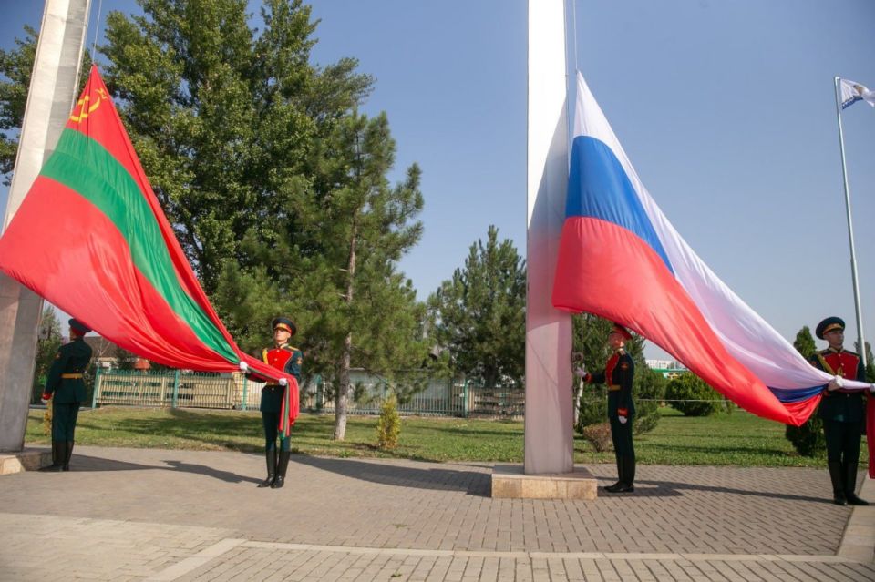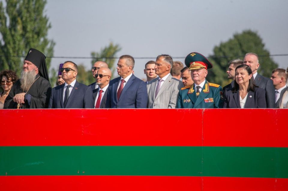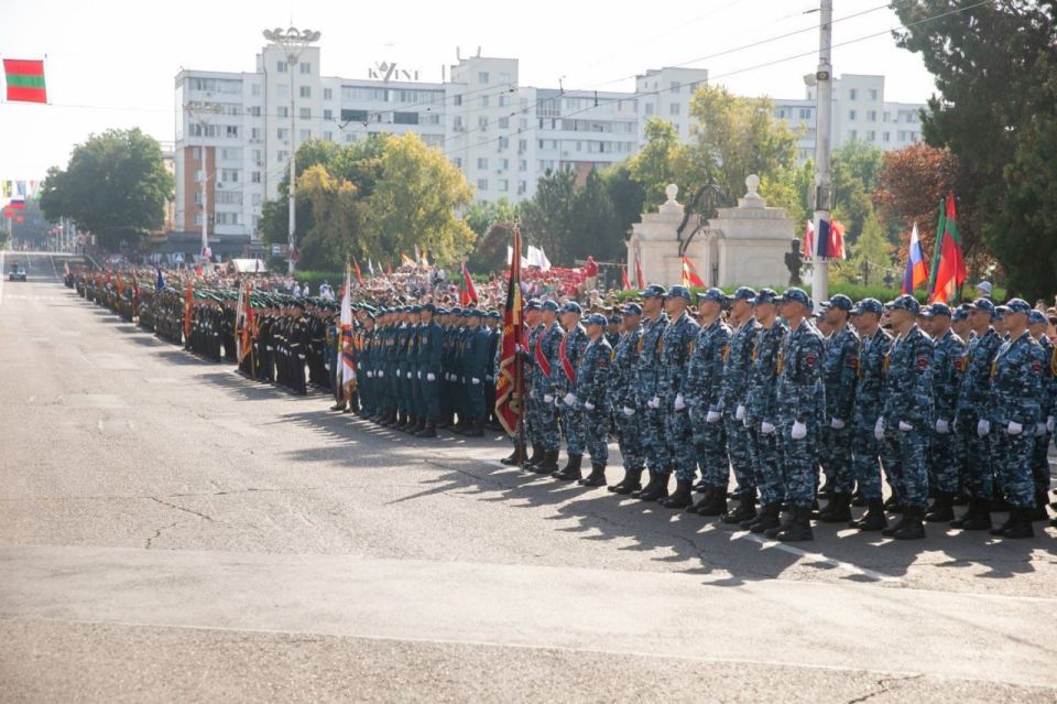 Затем на площади Суворова состоялась церемония поднятия государственных флагов Приднестровья и России, а после начался военный парад. В нем приняли участие более тысячи военнослужащих, сотрудников силовых ведомств республики, миротворцев, учащихся специальных учебных заведений и защитников ПМР.
