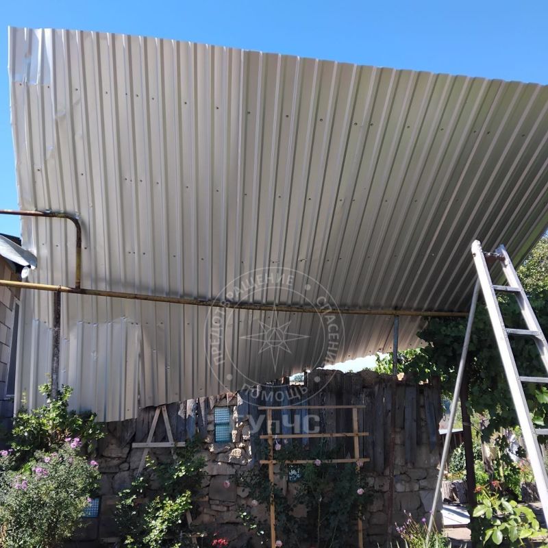 Сегодня хозяева дома в центре города приехали и увидели, что ветром с гаража снесло крышу. Конструкция легла прямо на газовую трубу, погнула её и стойки. За помощью хозяева обратились на 101.