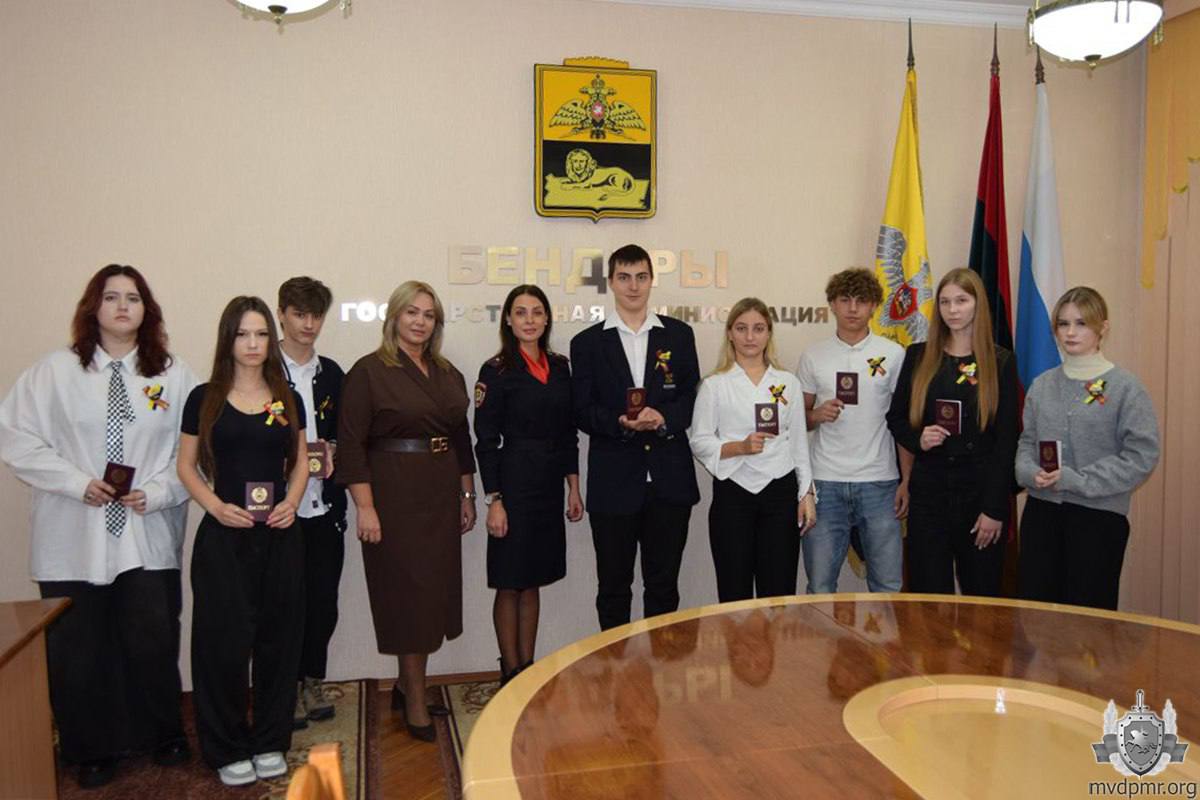 В торжественной обстановке начальник паспортного отдела г. Бендер вручила важный документ юным приднестровцам. «Получение паспорта – это первый шаг во взрослую жизнь. Паспорт – это свидетельство принадлежности к нашему государству. Вы сможете принимать активное участие в решении важных вопросов в городе и республике, – подчеркнула в обращении к молодёжи майор милиции. – С гордостью носите статус гражданина Приднестровской Молдавской Республики!»