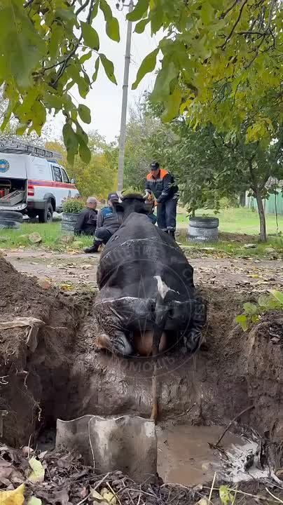На помощь прибыли спасатели ГУпЧС. Чтобы добраться до бурёнки, они разобрали металлический каркас и частично подкопали землю. С помощью цепи и лебёдки корову аккуратно подняли на поверхность.