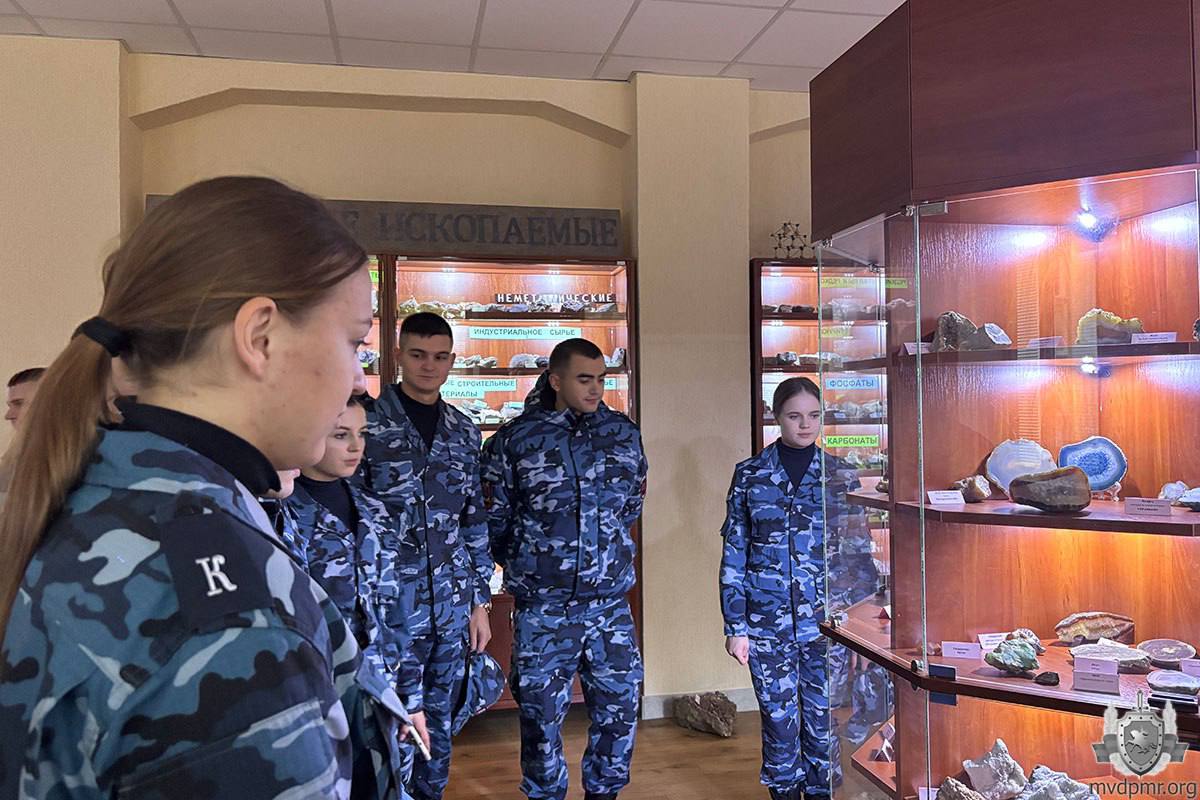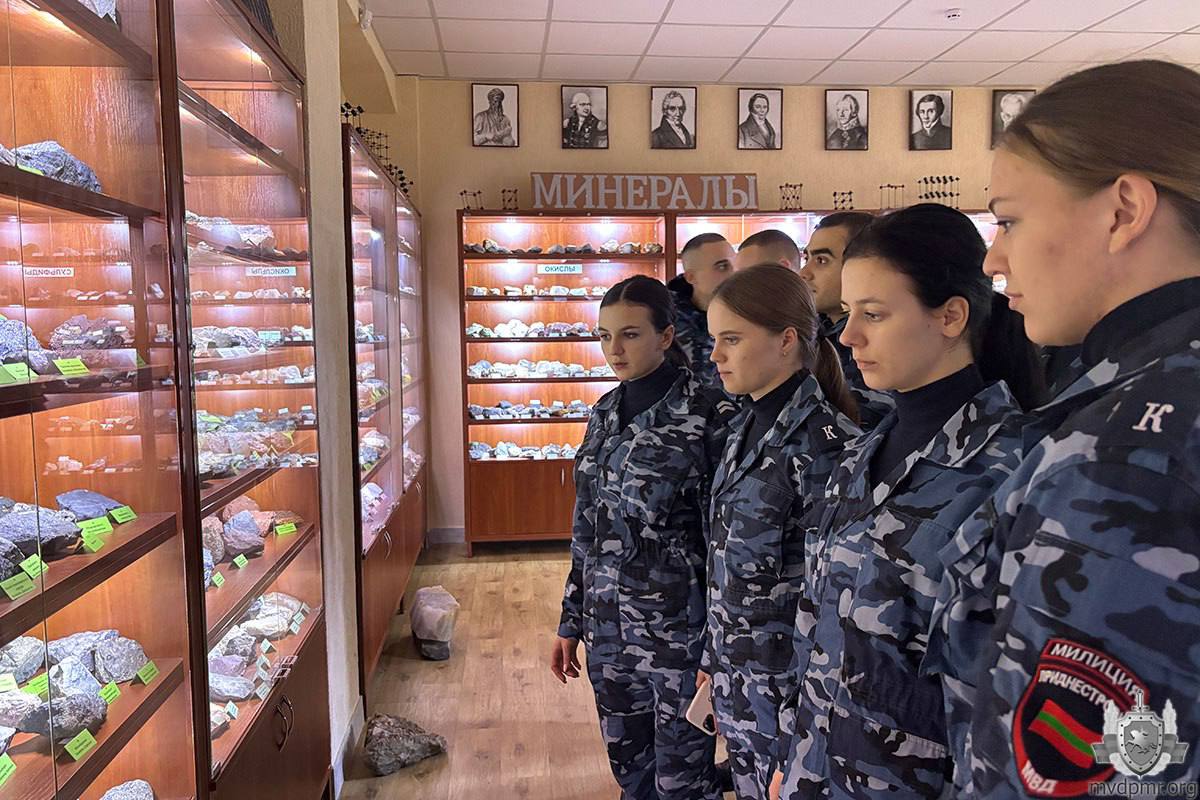 Музей насчитывает около трёх тысяч предметов, среди них редкие минералы, драгоценные камни, горные породы и полезные ископаемые. Все они когда-то были найдены в Приднестровье. О них рассказали курсантам ТЮИ, а также о первых организмах, растениях и животных, которые населяли нашу территорию.