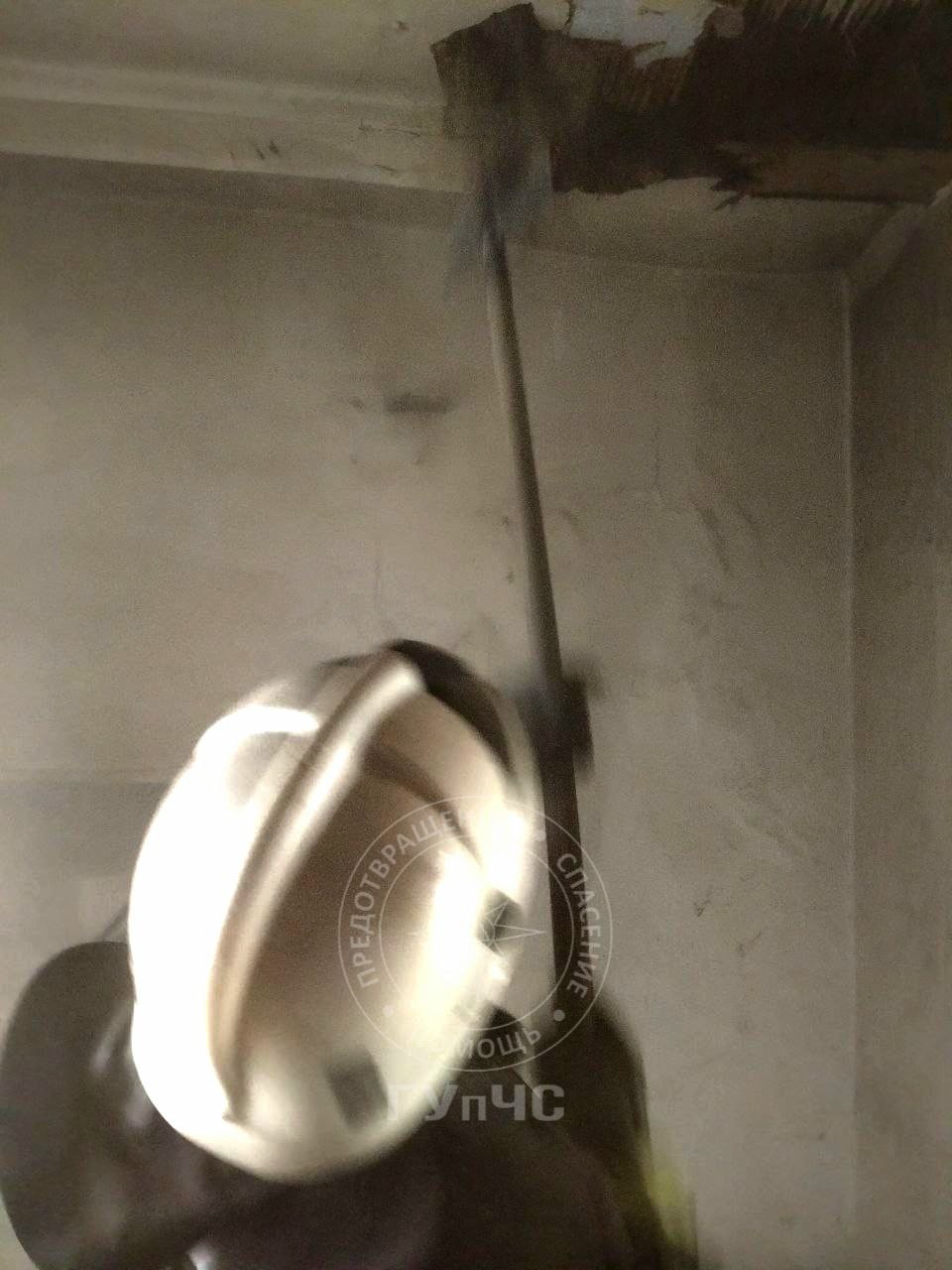 Огнеборцам пришлось частично разобрать потолочные перекрытия, чтобы найти очаг возгорания. Оказалось, балка тлела уже пару дней после того, как 76-летняя женщина перекалила печь. Всё это время продукты горения и угарный газ поступали в помещение, так как конструкция печи была уже нарушена.