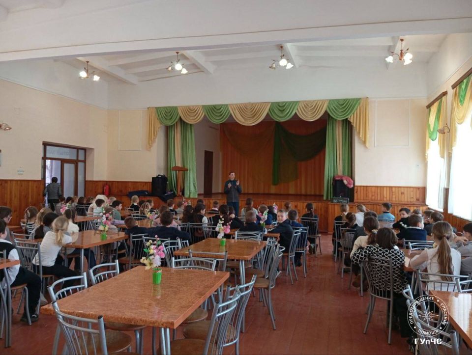 На фото столичные спасатели читают лекцию в школе села Терновка.