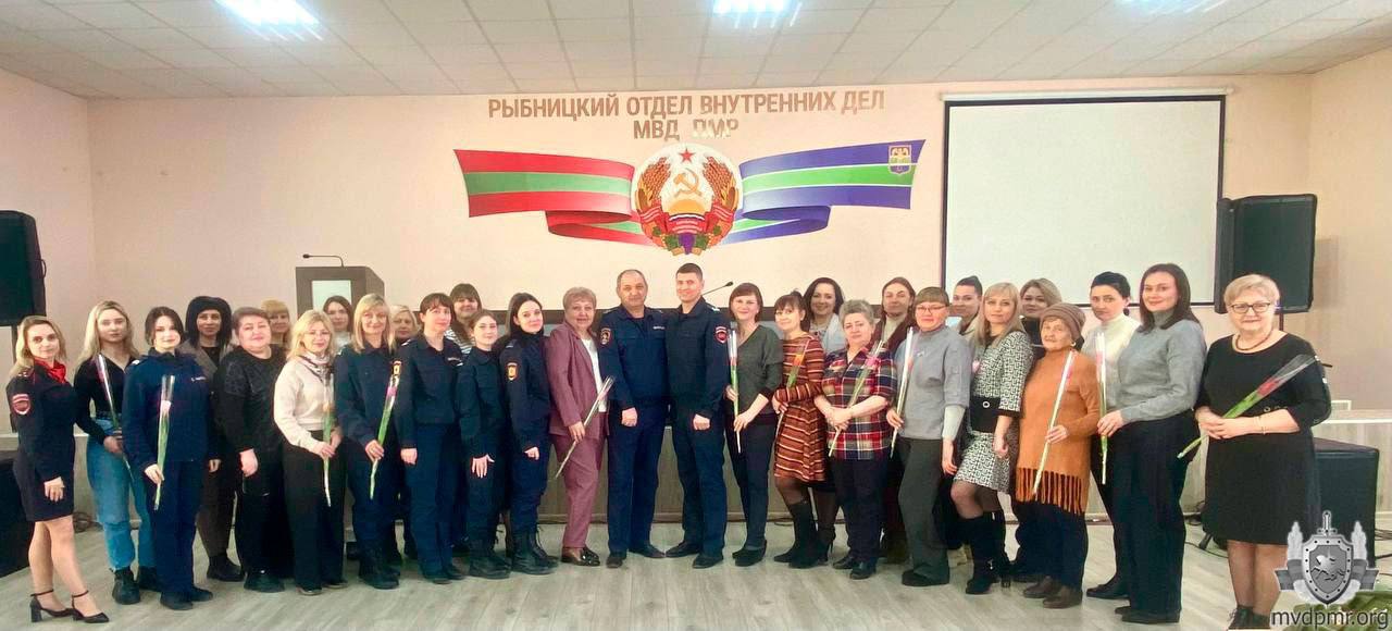С приветственными словами к сотрудницам обратились представитель общественной организации «Ветераны органоввнутренних дел Рыбницкого района и города Рыбница» Пётр Иванович Муляр и заместитель начальника Рыбницкого ОВД-начальник милиции общественной безопасности. Они выразили глубокую признательность виновницам торжества за преданную службу в органах внутренних дел, подчеркнув, что профессионализм, мудрость женщин помогают успешно выполнять важные задачи службы, а их красота и обаяние – источники вдохновения и гармонии в служебном коллективе.