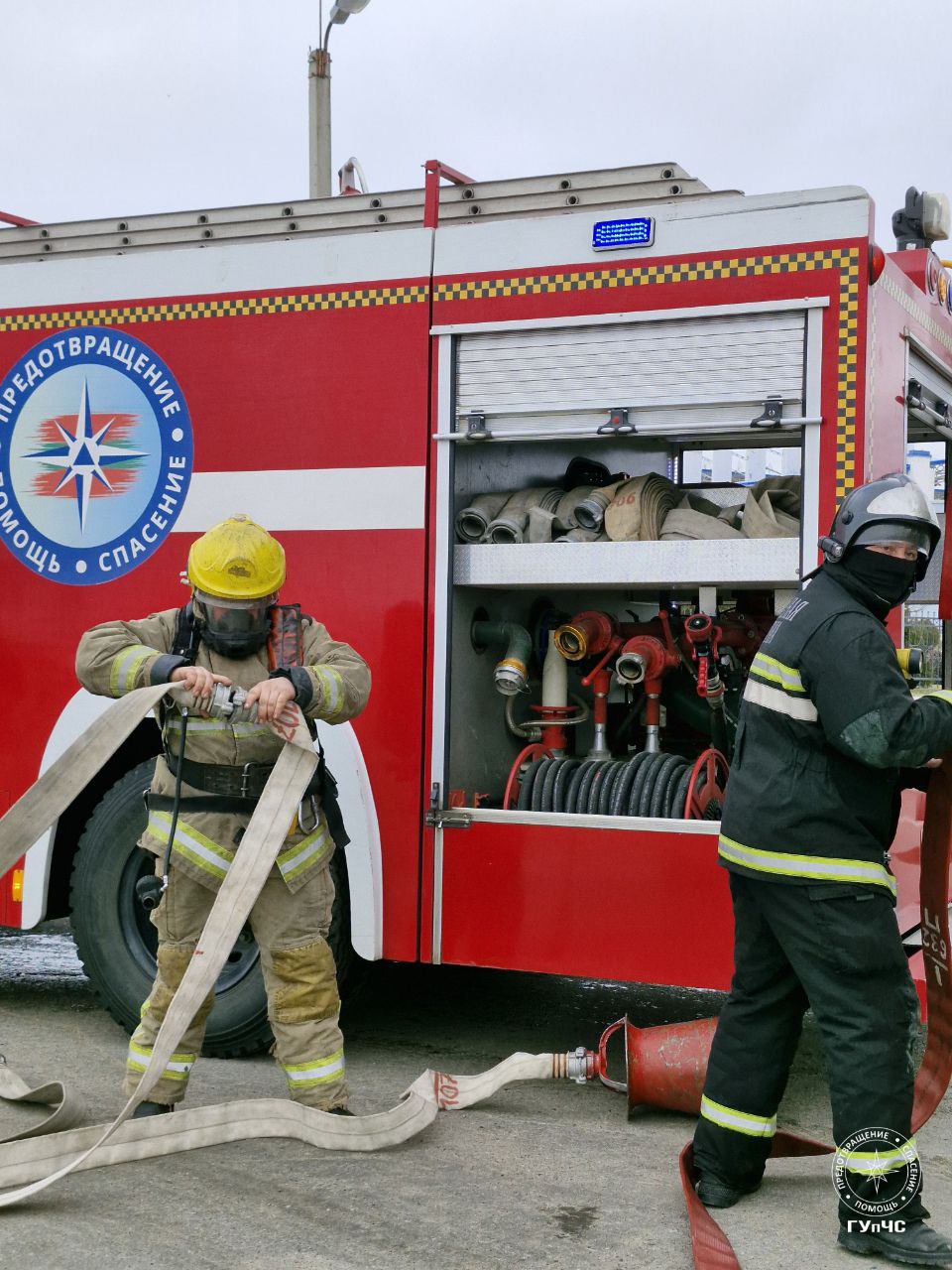 В учениях участвовали три пожарных расчёта. Топливо заливали специальной пеной, чтобы не допустить возгорания. На защиту резервуаров с горючим подали воду – рукавную линию протянули от водоисточника на территории спорткомплекса.