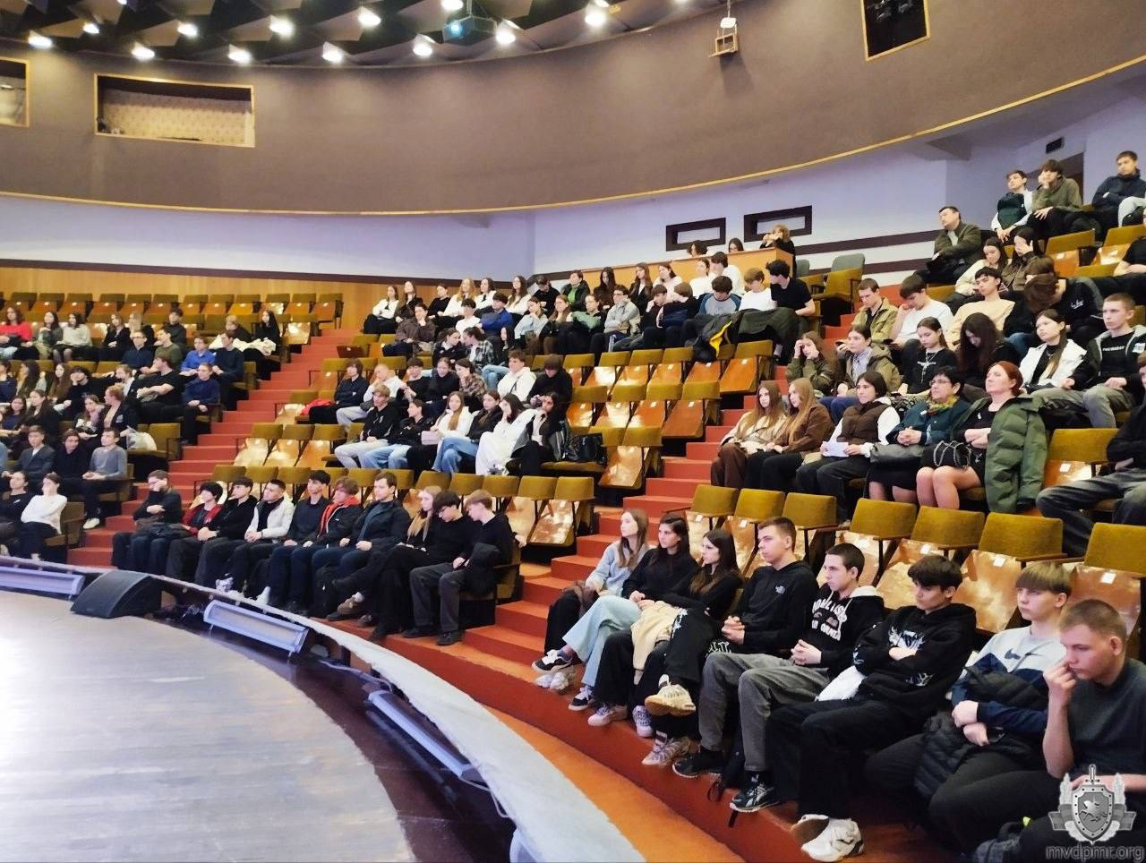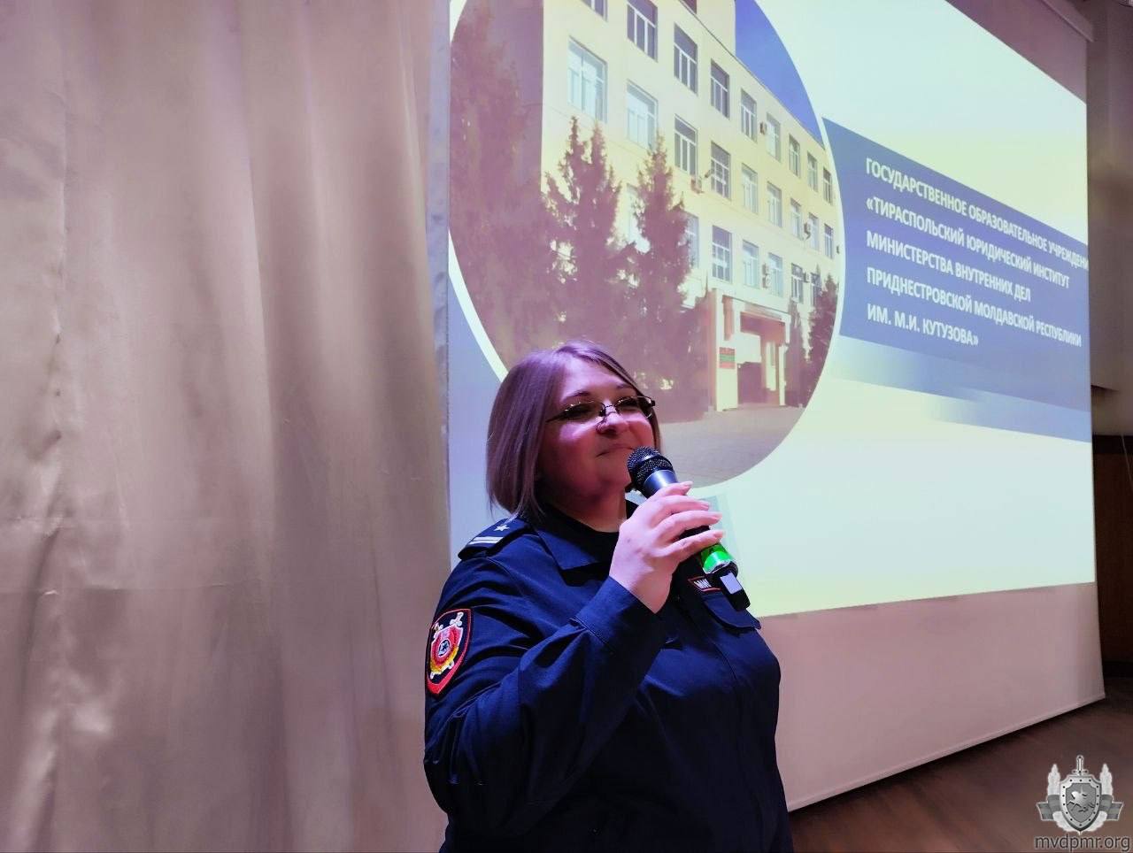 О будущей профессии, возможностях получения юридического образования и службе в органах внутренних дел говорили со школьниками офицеры Тираспольского юридического института МВД ПМР. Профориентационная встреча состоялась 23 марта в столичном Дворце детско-юношеского творчества. Её участниками стали около 200 учащихся 9 и 11-х классов из десяти городских школ.