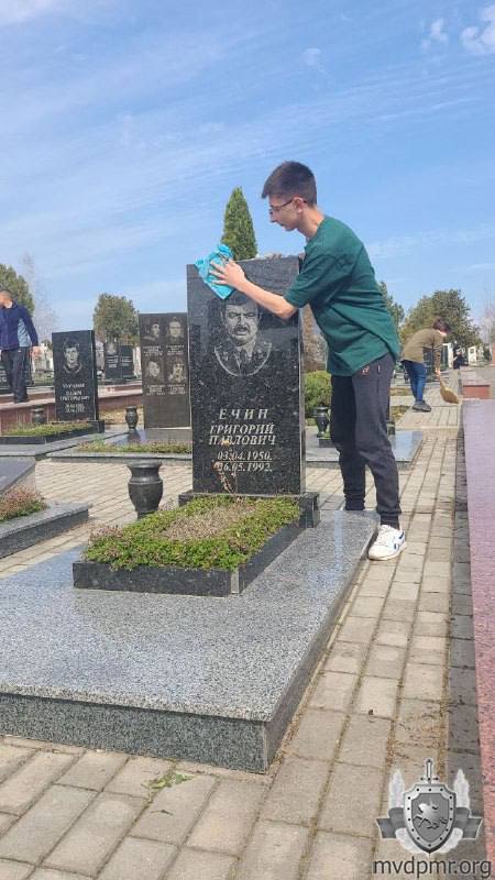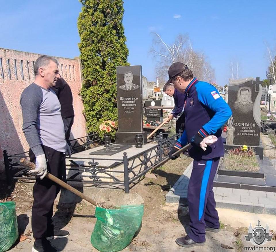 Милиционеры и представители Союза ветеранов УВД ПМР г. Бендеры, а также ученики 8–9-х классов 18 и 15-й школ в день субботника привели в порядок захоронения погибших сотрудников милиции, ветеранов Великой Отечественной войны и МВД на Аллее Героев Борисовского кладбища. Высадили на местах упокоения цветы.