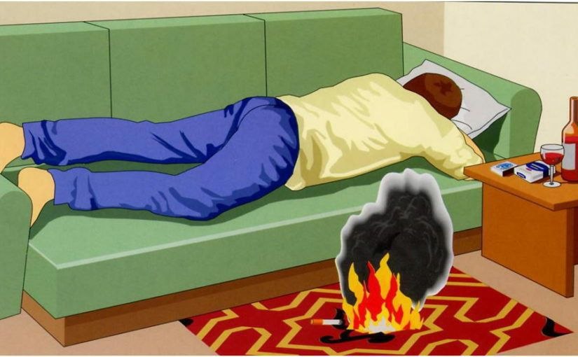 Непотушенный окурок может тлеть от 20 минут до трёх часов, прежде чем воспламенится. Упавший на постель или мебель уголёк вызывает тление, которое легко переходит в пожар.Алкоголь снижает контроль и реакцию — человек может уснуть с сигаретой в руке или забыть выключить плиту и обогреватель.