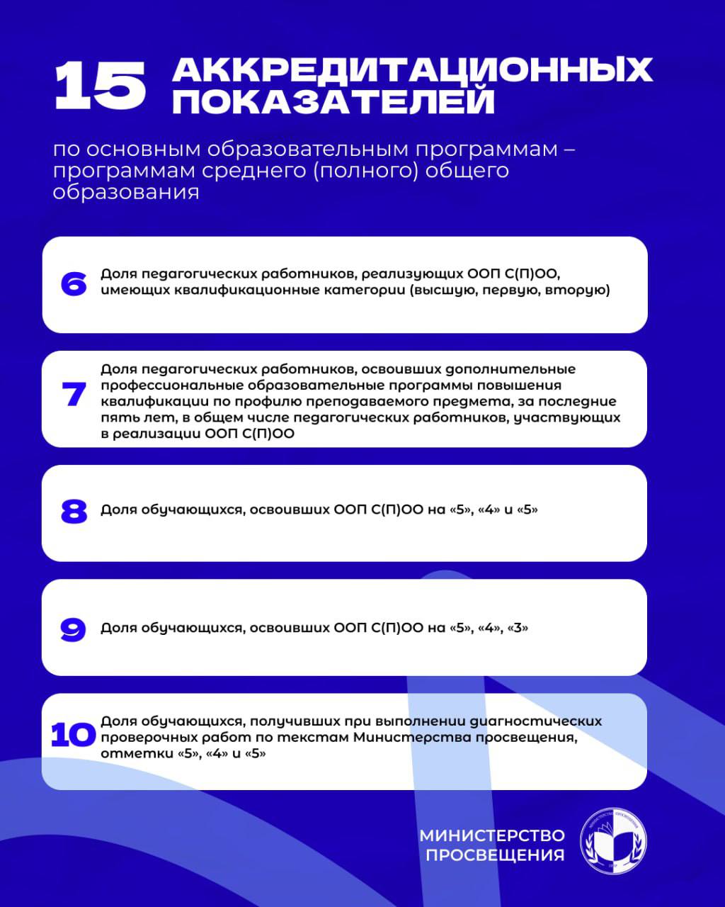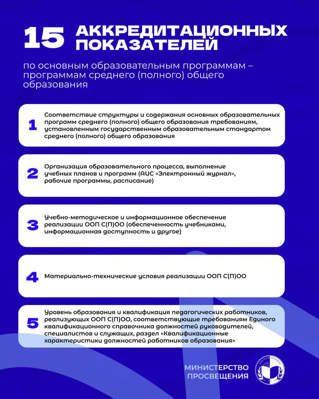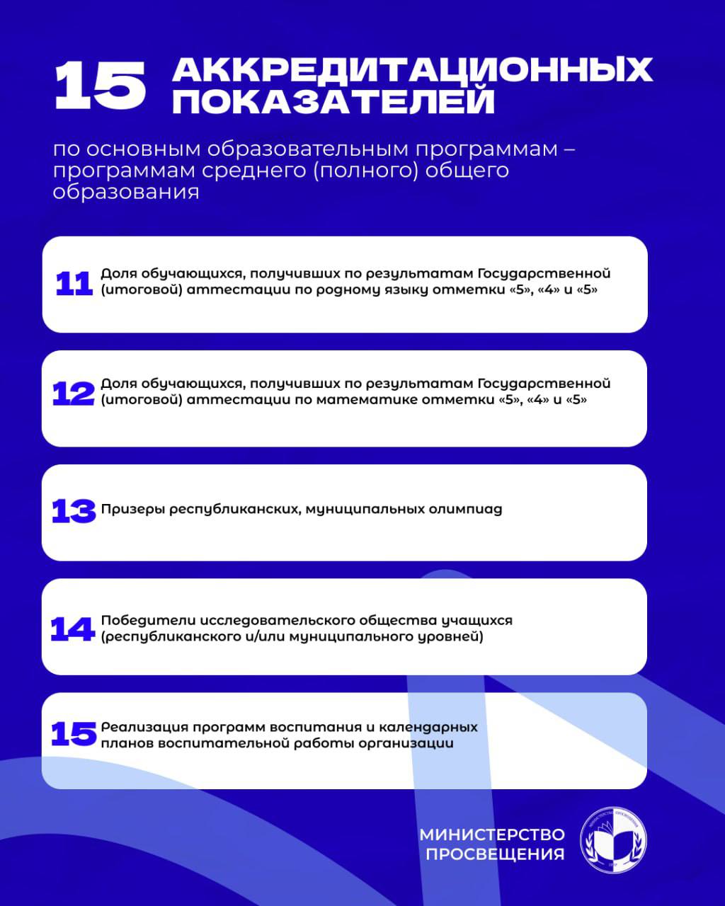 С этого учебного года процедура аккредитации проводится по балльной системе оценки и по новым правилам и требованиям – должно быть подтверждено соответствие качества образования аккредитационным показателям. Таких показателей, например, для уровня 10-11 классов – 15.