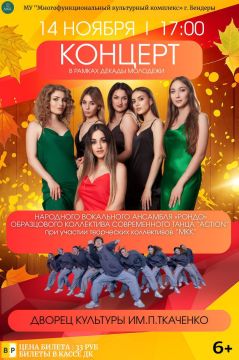 В бендерском ДК Ткаченко в эту пятницу, 14 ноября, будет 17:00 – концерт. Выступят вокальный ансамбль «Рондо», танцевальный коллектив «Аction» и другие молодые артисты.18:30 – дискотека «Осенние хиты».Билеты – в кассе...