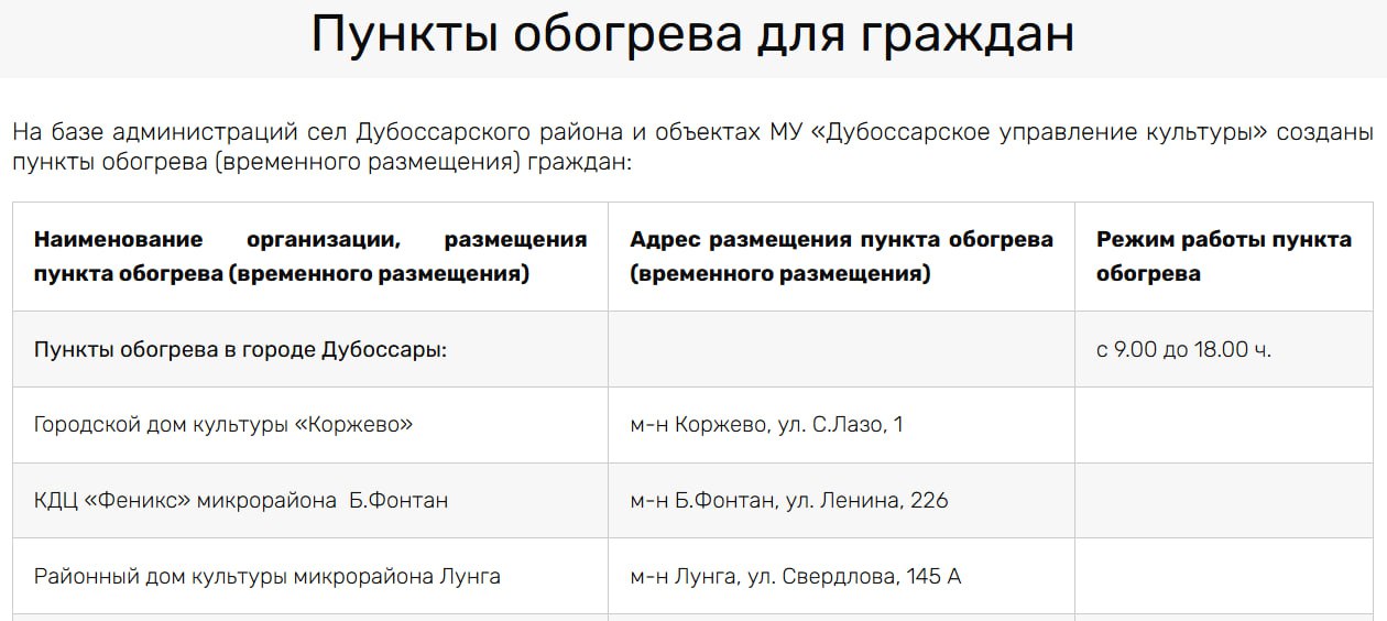 В Дубоссарском и Каменском районах открыли пункты обогрева и временного размещения. Они работают с 9:00 до 18:00.