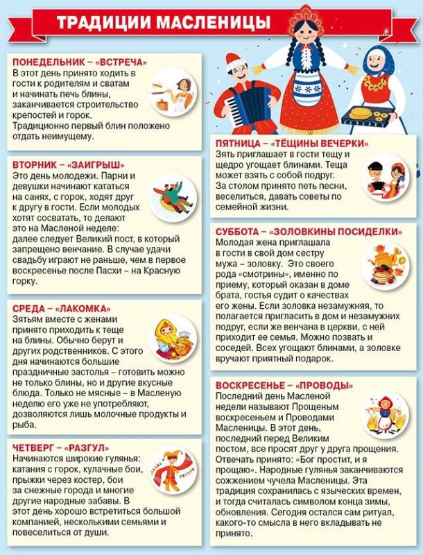 Понедельник - встреча. В первый день Узкой Масленицы сваты ходили в гости друг к другу на блины.