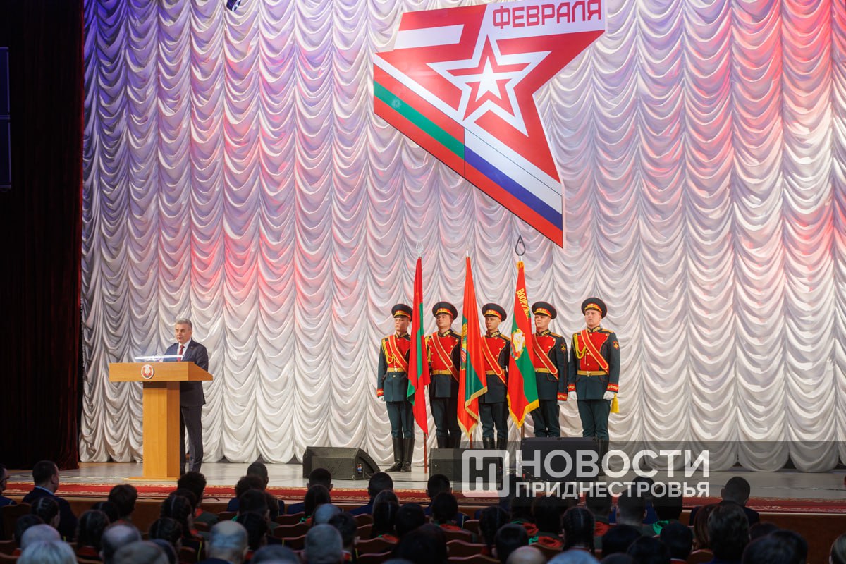 Президент ПМР Вадим Красносельский принял участие в торжественном собрании ко Дню защитника Отечества во Дворце Республики.
