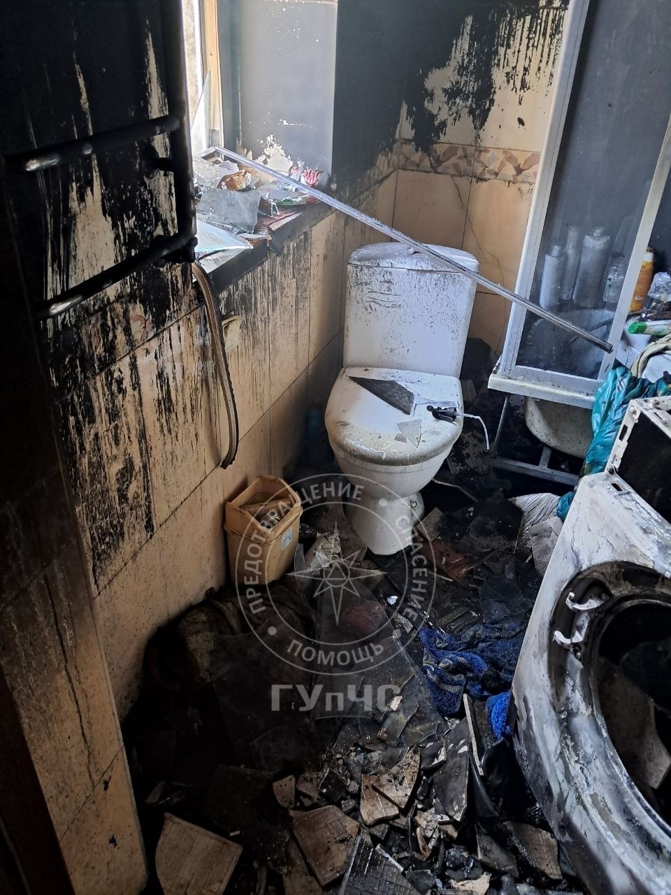 Огонь повредил бытовую технику, душевую кабину и отделку, стены закопчены.
