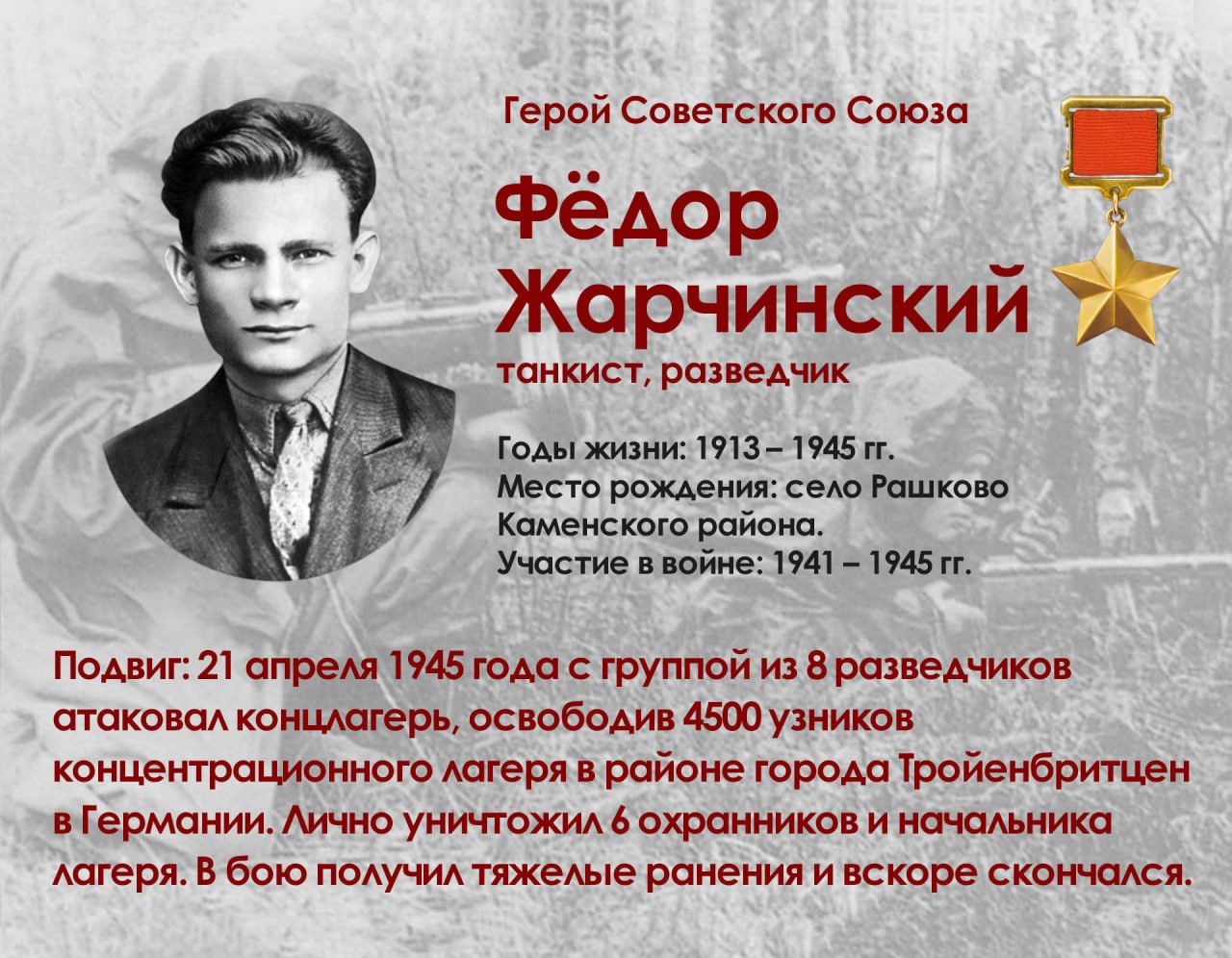 «Корпус Ермакова, наступавший южнее корпуса Белова, сметая на своем пути неприятеля, овладел городами Беелитц, Тройенбритцен, Ютербог. Из фашистского лагеря в районе Тройенбритцена было освобождено 1600 французов, англичан, датчан, бельгийцев, норвежцев и заключенных других национальностей, томившихся в гитлеровских застенках. Среди них оказался командующий вооруженными силами Норвегии генерал-майор Отто Руге.Первым в этот лагерь, возглавляя группу разведчиков, ворвался старший лейтенант Федор Иванович Жарчинский. В ожесточенной схватке с охраной он был ранен, но, собрав последние силы, продолжал бой, ему удалось убить эсэсовского палача — начальника лагеря, после чего сопротивление охраны прекратилось. Рана Жарчинского оказалась смертельной, он скоро скончался».