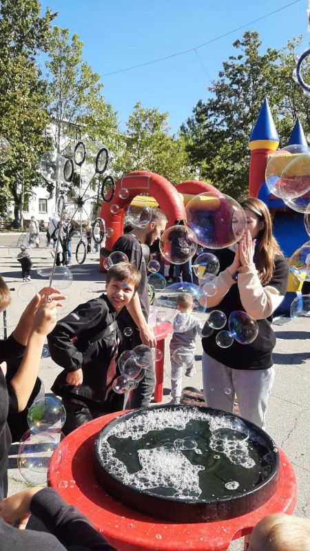 Для детей организовали праздник с батутами, мыльными пузырями, аниматорами, танцами и сладостями.