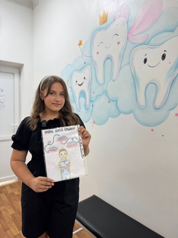 Маша и Максим нарисовали Сергея Крейчи. Девочка скоро будет ставить у него брекеты.Артём – Дору Михайличенко.В Республиканской стоматологии юным художникам подарили электрические зубные щётки