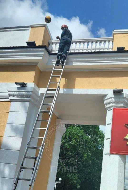 Дети закинули мяч на арку парка «Победа». Его спасатели тоже сняли.