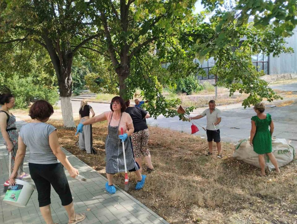 Коллектив Бендерской детской школы искусств провёл субботник. Собрали сухую траву, побелили деревья и бордюры.