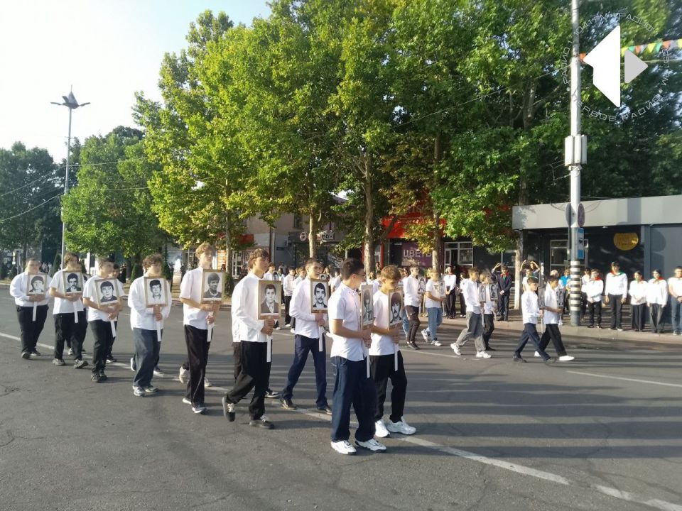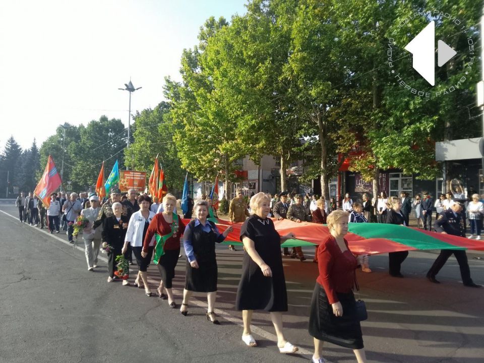 Старт мероприятиям дан на центральной площади города. Здесь прошел парад защитников и трудовых коллективов, а также бессмертный полк. Над главной площадью подняли флаги Приднестровья и России.