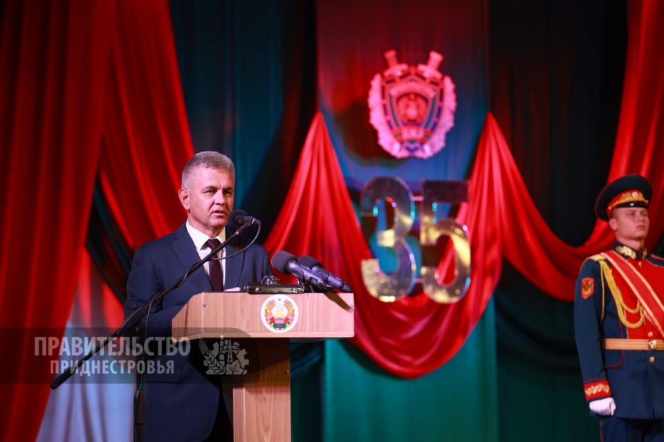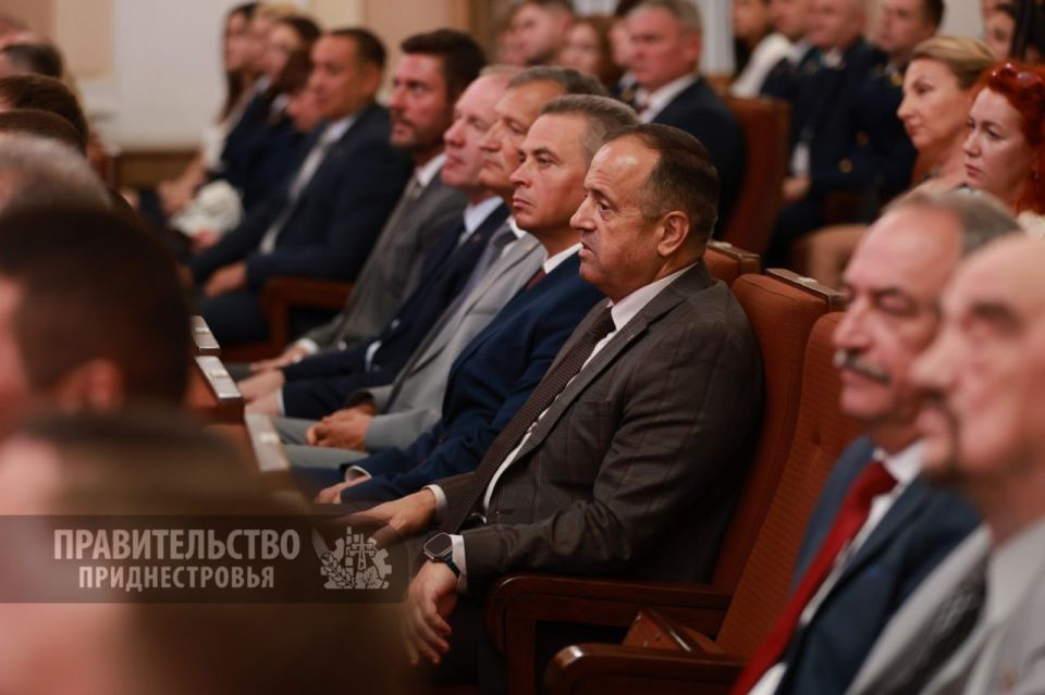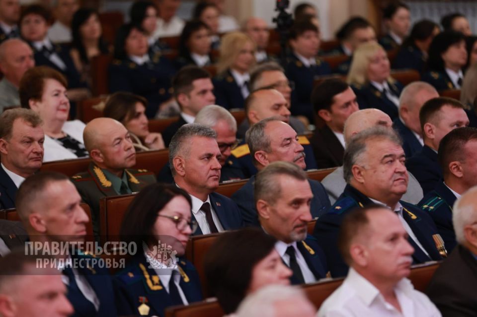 Торжественное собрание проходит в Городском дворце культуры. Среди почетных гостей Президент Вадим Красносельский, члены Правительства во главе с Премьером Александром Розенбергом, Первый Президент Игорь Смирнов, парламентарии, сотрудники и ветераны ведомства.