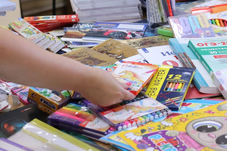 Акция проходит уже пятый год — сотрудники приносят в коробки тетради, ручки, наборы для творчества.