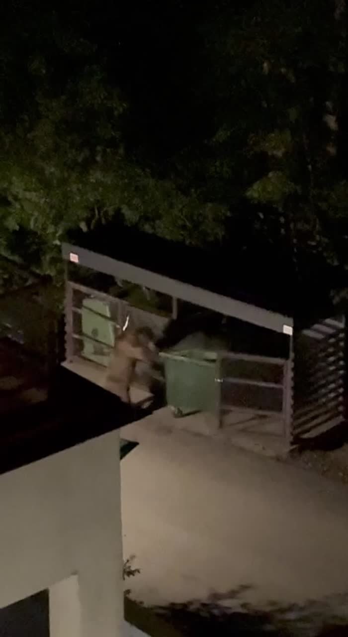 В этот раз мохнатый беспредельщик убедился, что за ним никто не следит, и укатил мусорный контейнер.