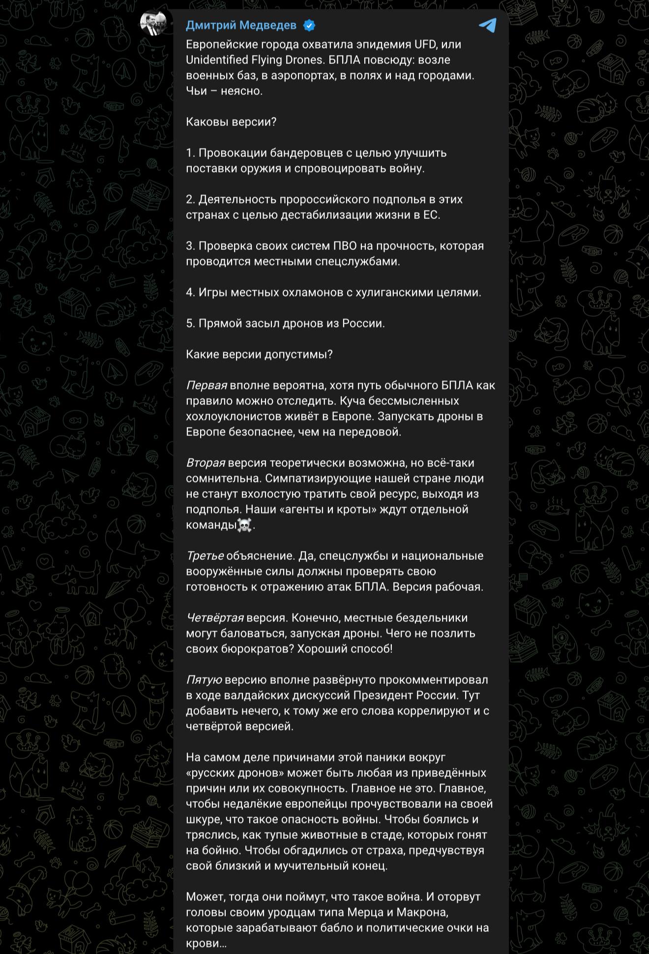 «Главное, чтобы недалёкие европейцы прочувствовали на своей шкуре, что такое опасность войны. Чтобы боялись и тряслись, как тупые животные в стаде, которых гонят на бойню. Чтобы обгадились от страха, предчувствуя свой близкий и мучительный конец. Может, тогда они поймут, что такое война. И оторвут головы своим уродцам типа Мерца и Макрона, которые зарабатывают бабло и политические очки на крови…».