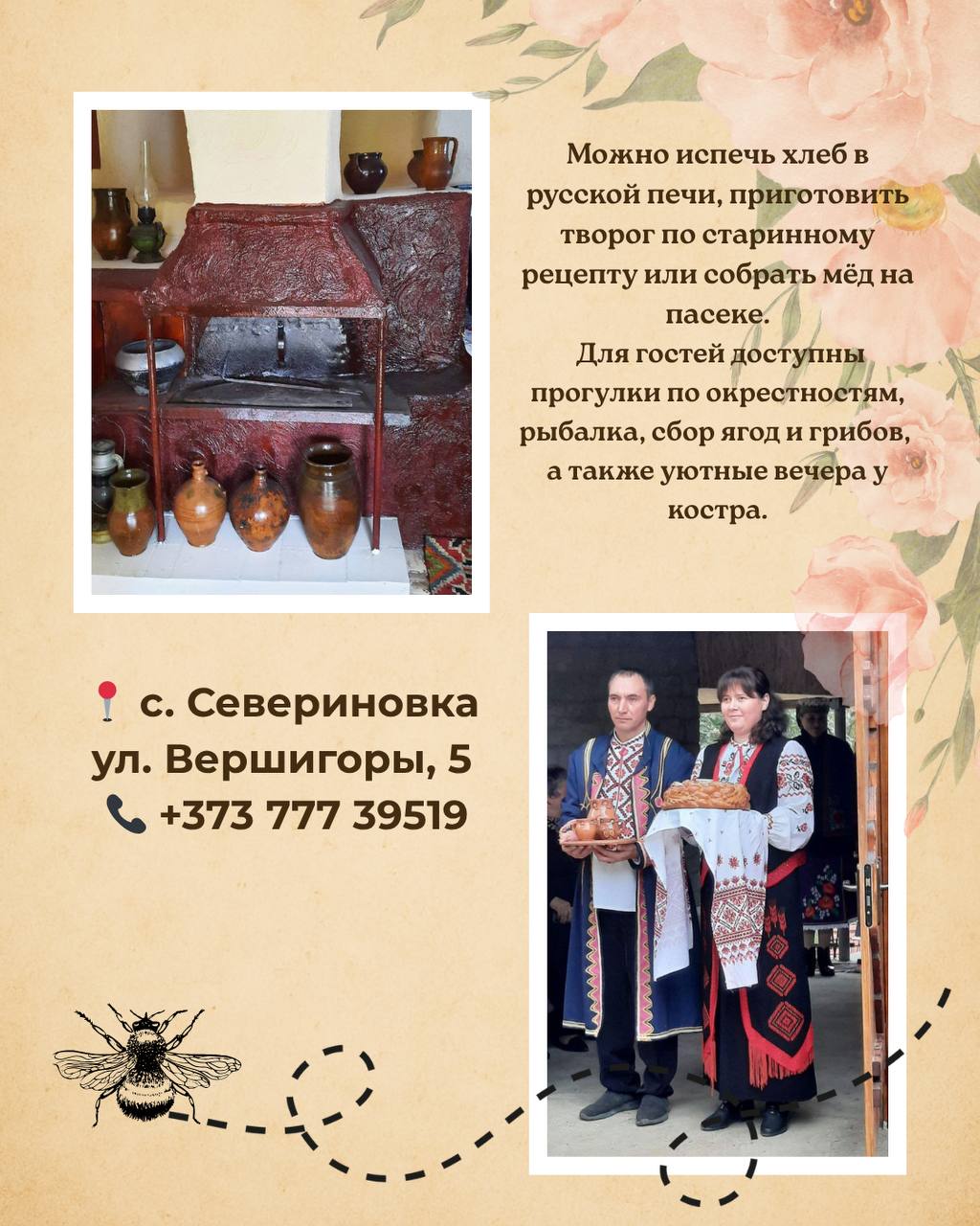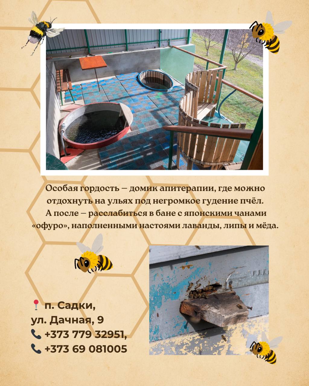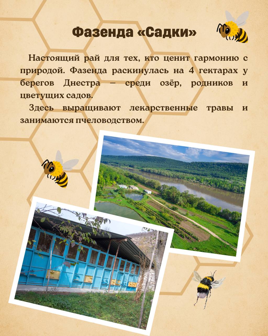 Фазенда у берегов Днестра среди озёр и садов. Особая гордость — домик апитерапии, где можно отдыхать на ульях под тихое гудение пчёл.