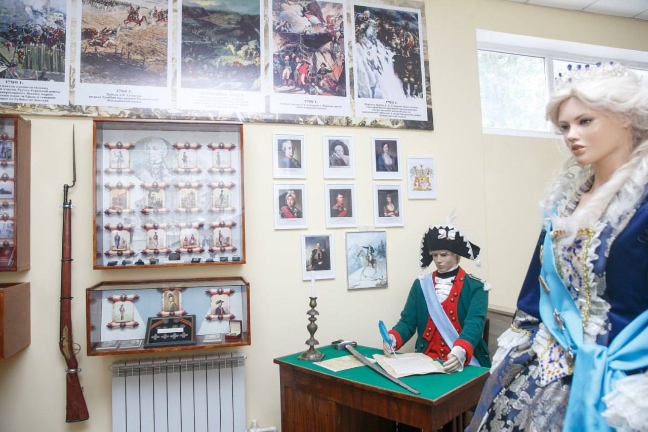 Музей сделали для школьников: вместо артефактов — макеты, муляжи, копии документов и творческие работы воспитанников. Есть инсталляция, где Суворов пишет донесение Екатерине II.