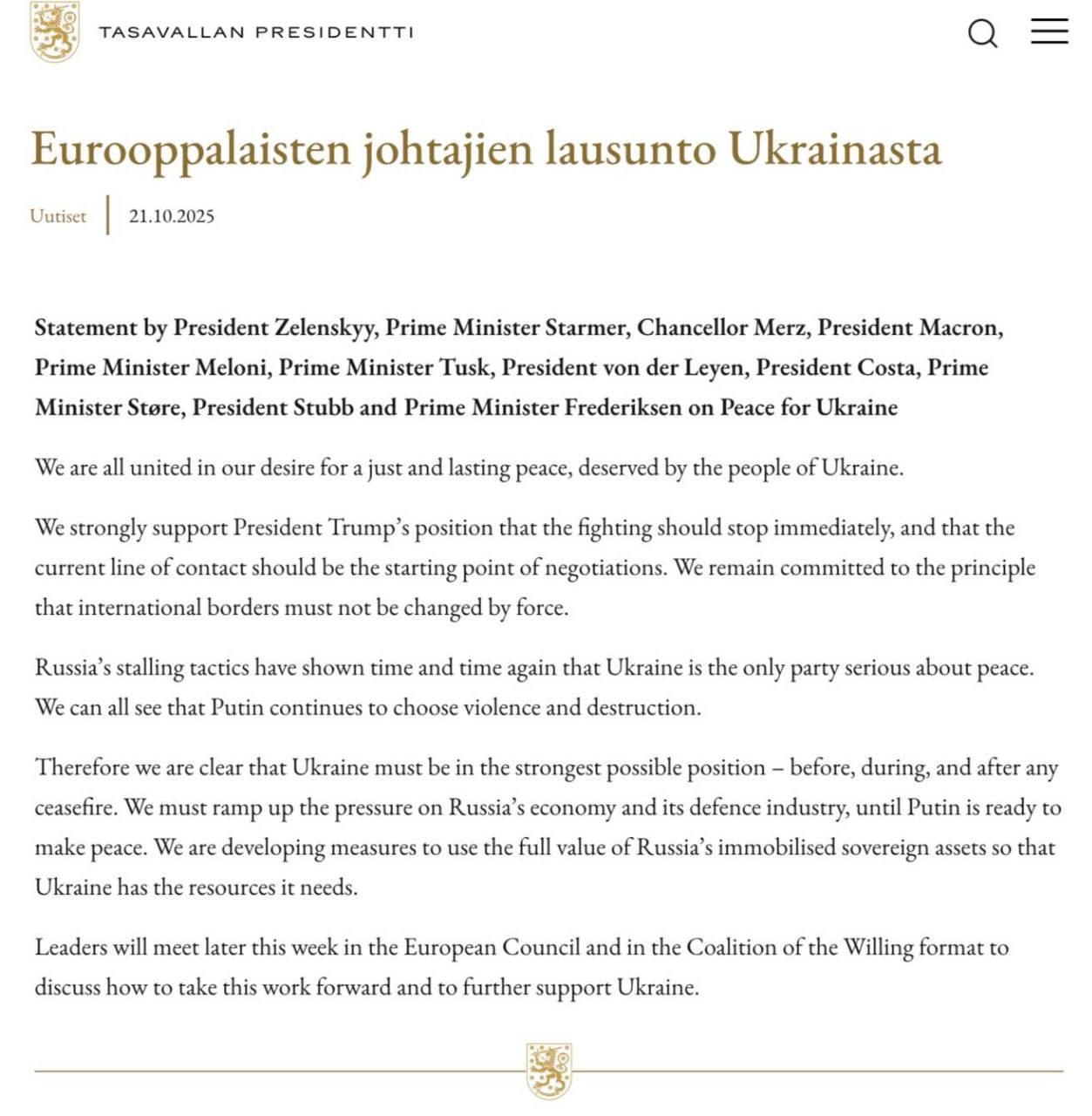 Мы решительно поддерживаем позицию президента Трампа о необходимости немедленного прекращения боевых действий и о том, что нынешняя линия соприкосновения должна стать отправной точкой для переговоров. Мы ясно понимаем, что Украина должна занимать максимально сильную позицию — до, во время и после любого перемирия. Мы должны усилить давление на экономику и оборонную промышленность России, пока Путин не будет готов к миру. Мы разрабатываем меры по использованию всей стоимости заблокированных суверенных активов России, чтобы Украина получила необходимые ресурсы.