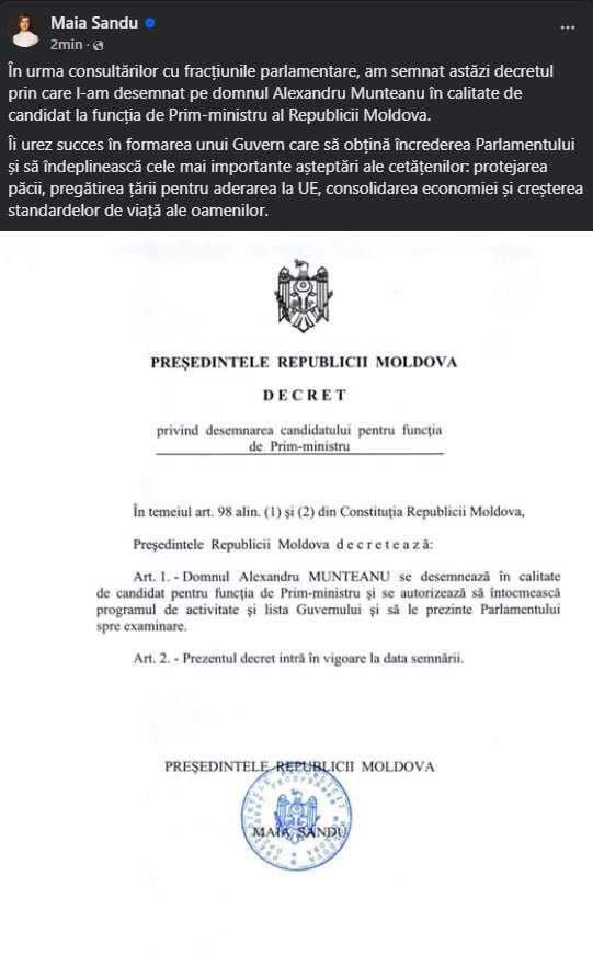 Майя Санду официально выдвинула Александру Мунтяну на пост премьер-министра Республики Молдова.