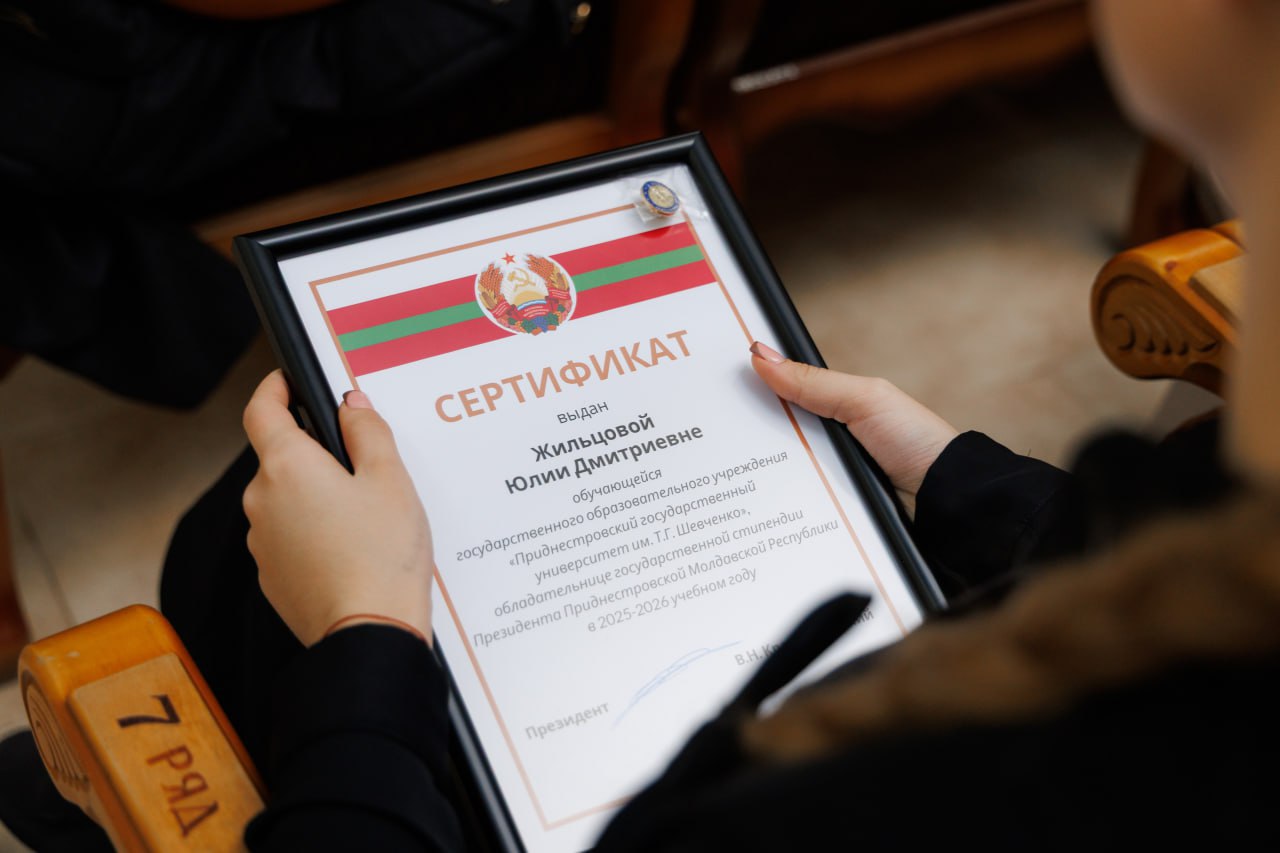 В малом зале Дворца Республики состоялась церемония вручения сертификатов на получение государственной стипендии Президента ПМР. Это ежегодная практика. Начиная с 2001 года, таким образом отмечают особые достижения представителей приднестровской молодежи – отличников учебы, победителей спортивных соревнований и творческих конкурсов, активных участников общественной жизни. В нынешнем учебном году Глава государства удостоил именных стипендий 101 человека: 29 студентов вузов, 49 –учреждений среднего профессионального образования, 13 учащихся, осваивающих дополнительные программы художественно-эстетической направленности, троих спортсменов и семерых школьников, ярко проявивших себя в творчестве в рамках кружковой деятельности. Среди получателей президентской стипендии студенты ПГУ им. Шевченко, Бендерского высшего художественного колледжа им. Постойкина и государственного института искусств им. Рубинштейна, курсанты ТЮИ МВД ПМР и Военного института Минобороны, воспитанники Училища олимпийского резерва, представители колледжа технологий и управления, тираспольских техникумов коммерции и информатики и права, столичного аграрно-технического колледжа, дубоссарского индустриального техникума, слободзейского, каменского и рыбницкого политехов, педагогического и медицинского колледжей. По линии допобразования стипендиатами стали представители ДДЮТ городов и районов республики, детских музыкальных и художественных школ, школ искусств, школьных секций.