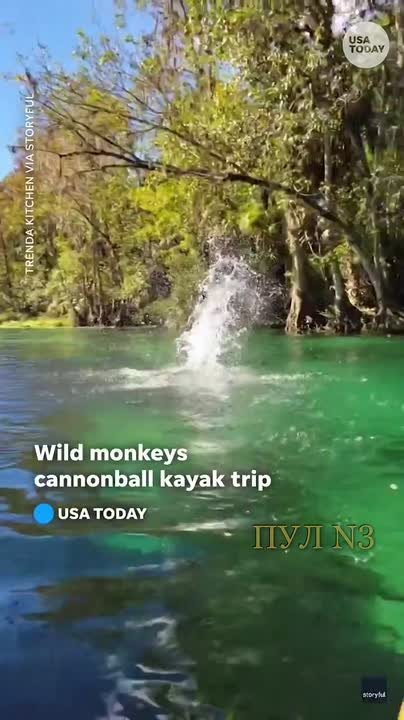Дикие макаки показали туристам в государственном природном парке, как переправляются через реку.