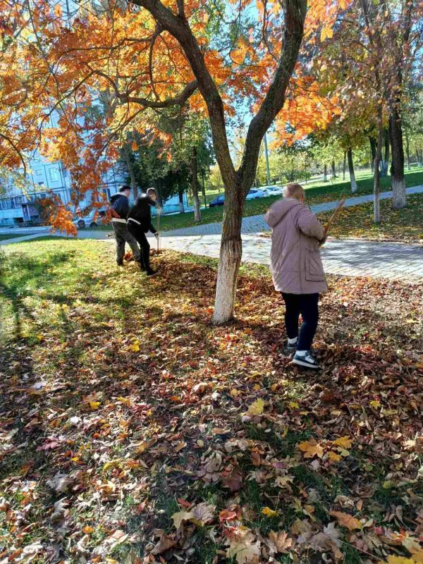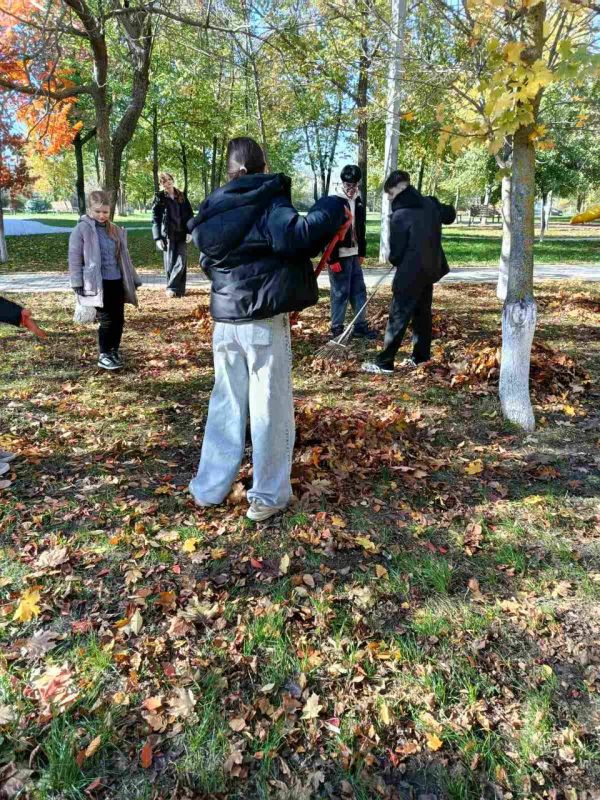 Ученики школы активно убирали опавшую листву на территории учебного заведения, показывая заботу о чистоте и природе вокруг.