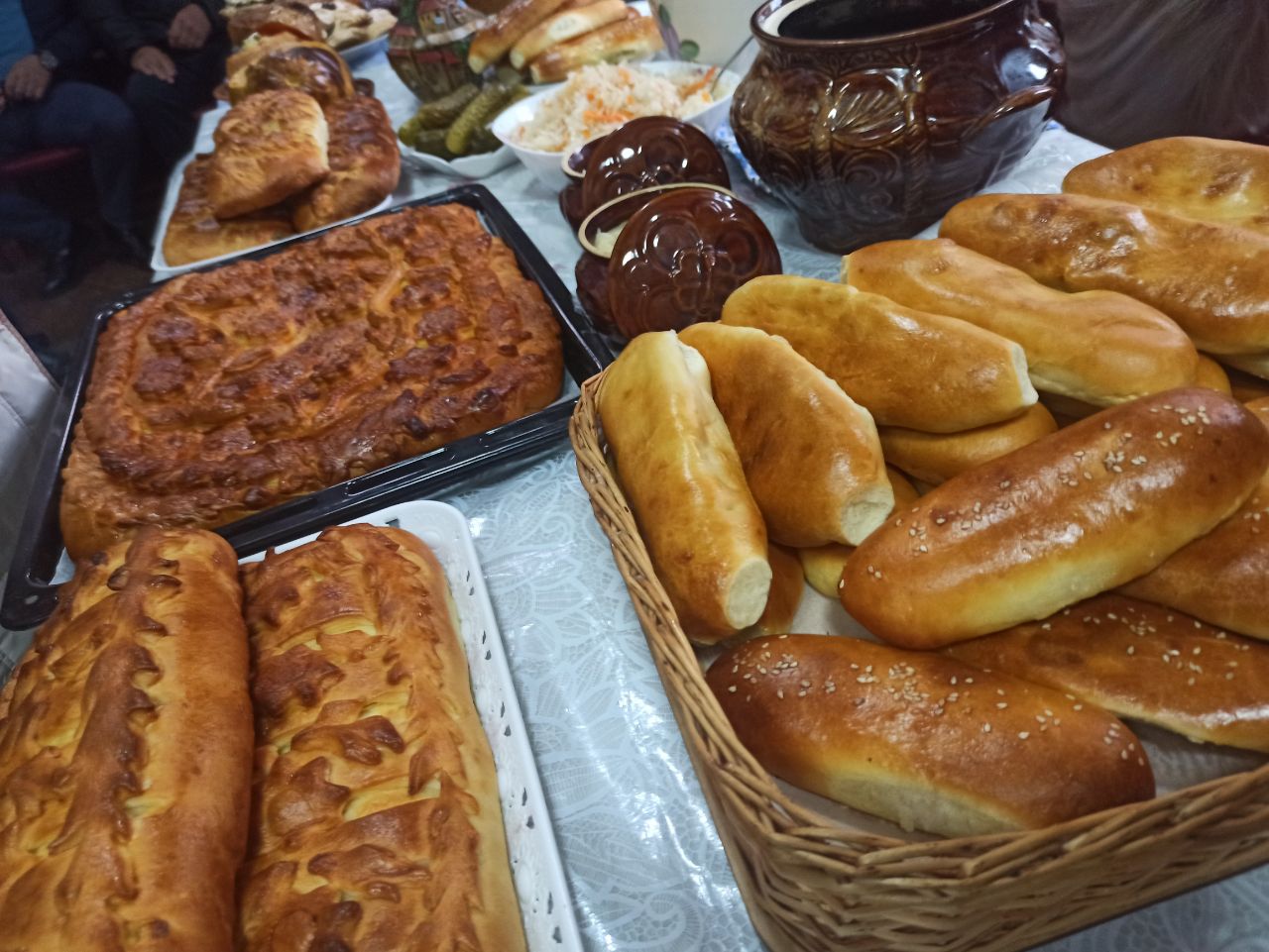 В фойе ДДЮТ – выставка работ народных мастеров. Всех желающих угощают горячим чаем из самовара и блюдами русской кухни.