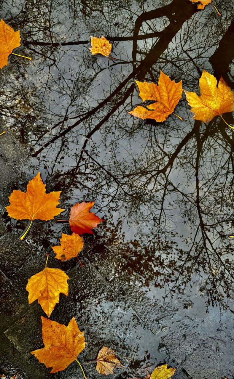 Даже в отражении осенней лужи природа остаётся прекрасной.