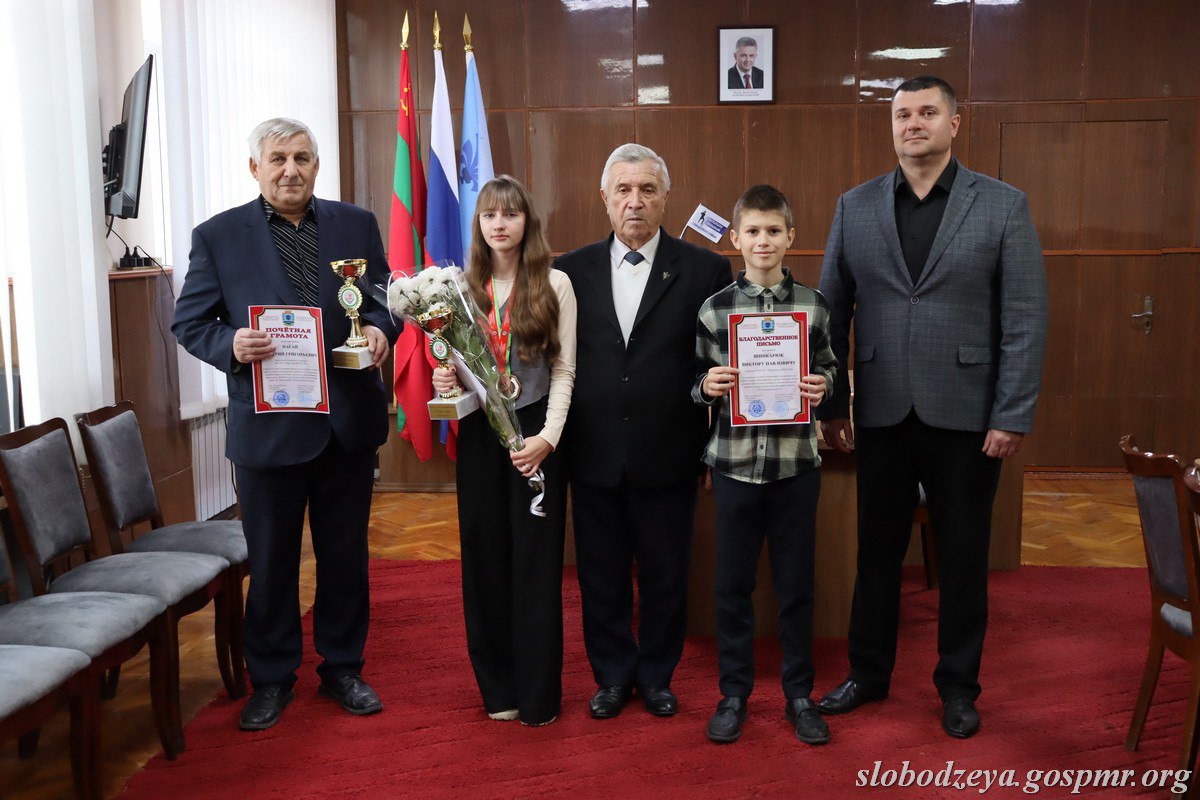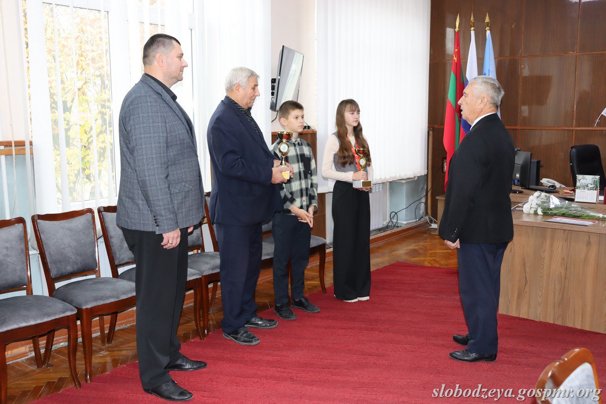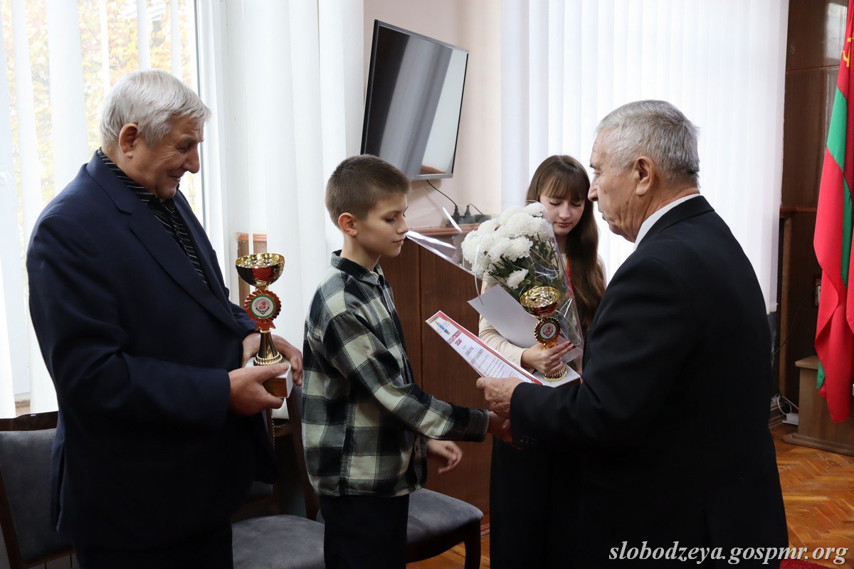 Глава госадминистрации Василий Тищенко провел встречу с юными слободзейцами, воспитанниками Чобручской ДЮСШ №4, недавно вернувшимися с чемпионата мира по шашкам-64 – Елизаветой Трофимовой и Виктором Шинкарюком и их тренером Валерием Нагай.