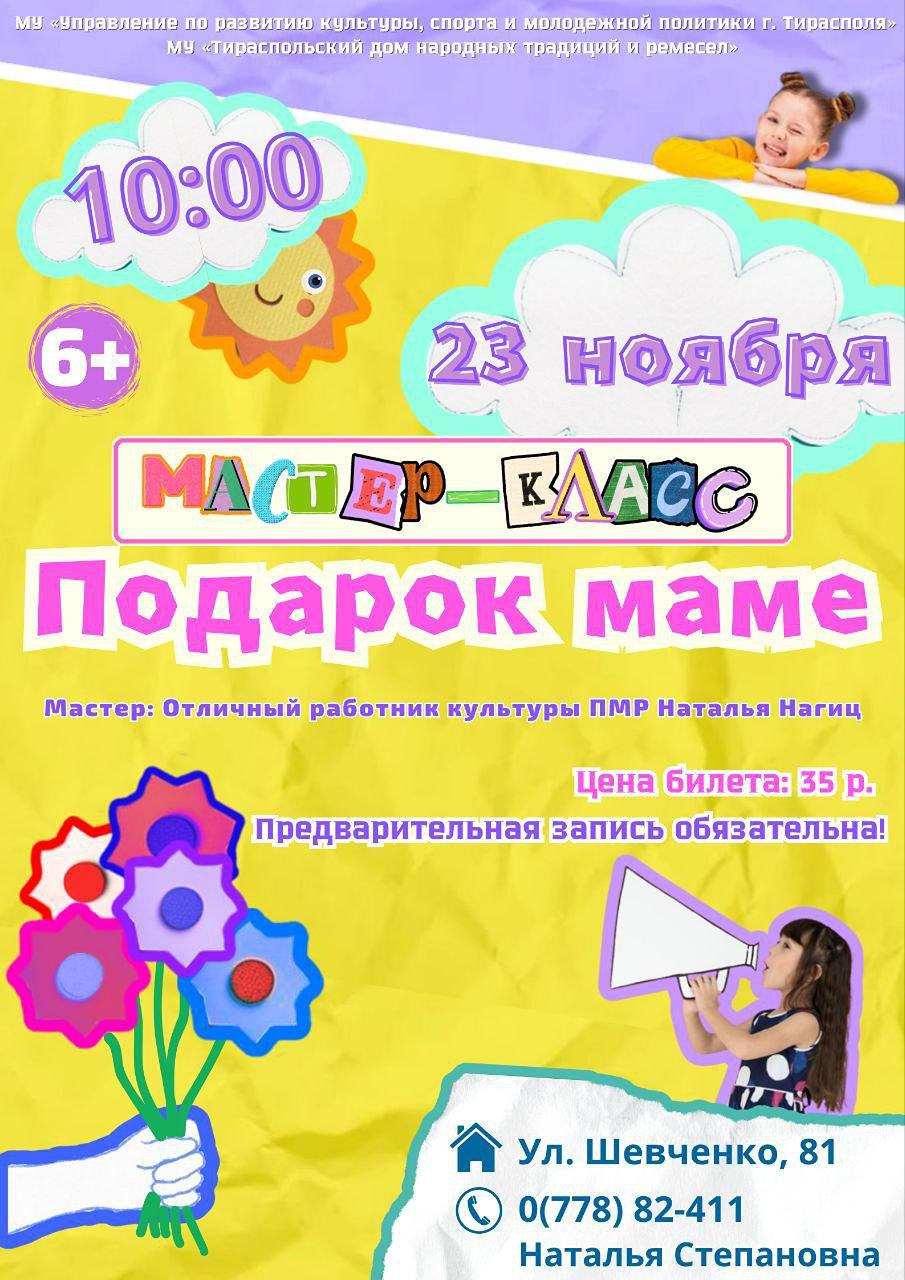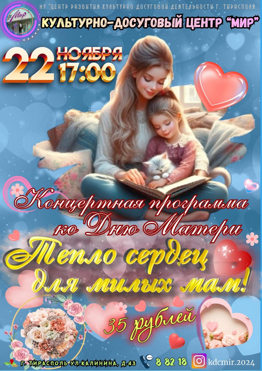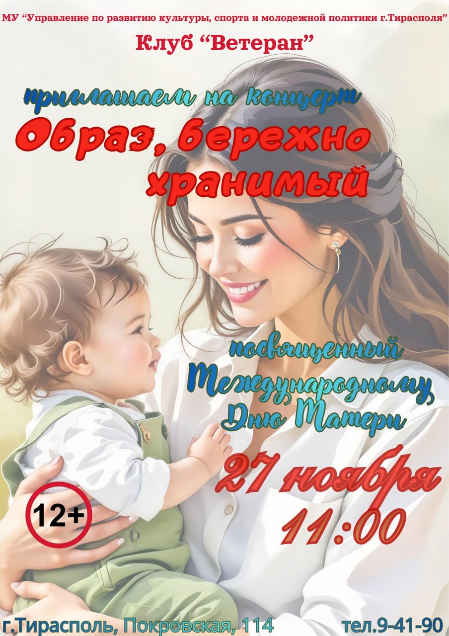 Учреждения культуры Тирасполя подготовили для вас праздничные мероприятия, наполненные атмосферой тепла и признательности. Приходите с близкими и подарите себе и любимым мамам моменты радости, улыбок и сердечных слов.