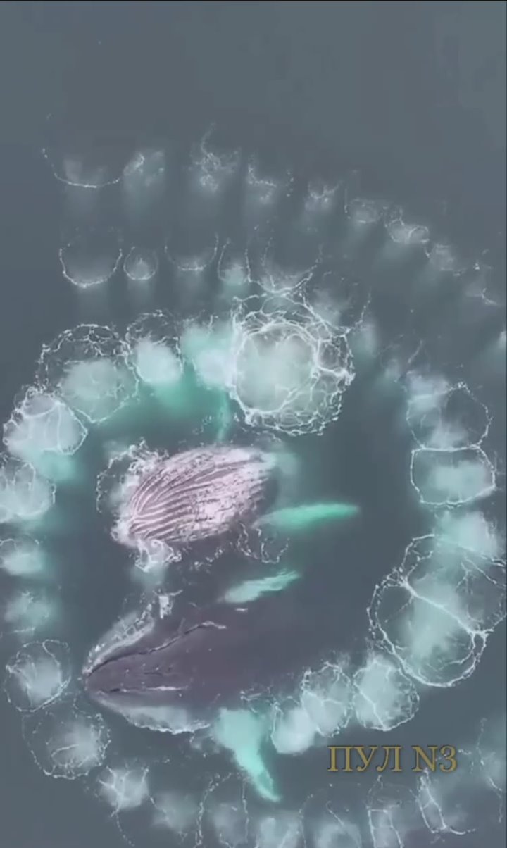 В Антарктиде фотограф запечатлел, как два горбатых кита создали идеальную спираль из пузырей. Учёные говорят, что такая точная золотая спираль - редкость даже среди китов. С помощью спиралей киты загоняют криль, чтобы потом подняться на поверхность и заглотить добычу.
