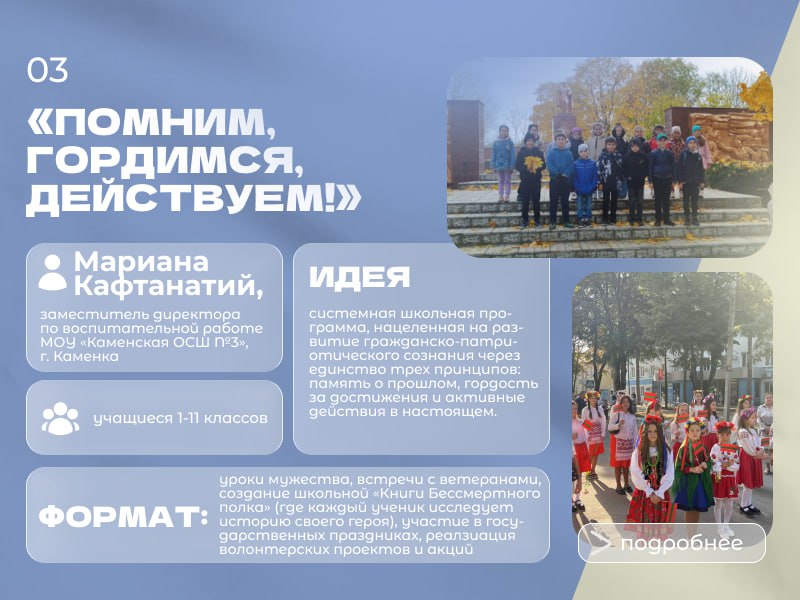 Министерство просвещения представляет лонгрид с 15 лучшими практиками гражданско-патриотического воспитания. Материал подготовлен по итогам одноимённого республиканского конкурса и включает работы финалистов.