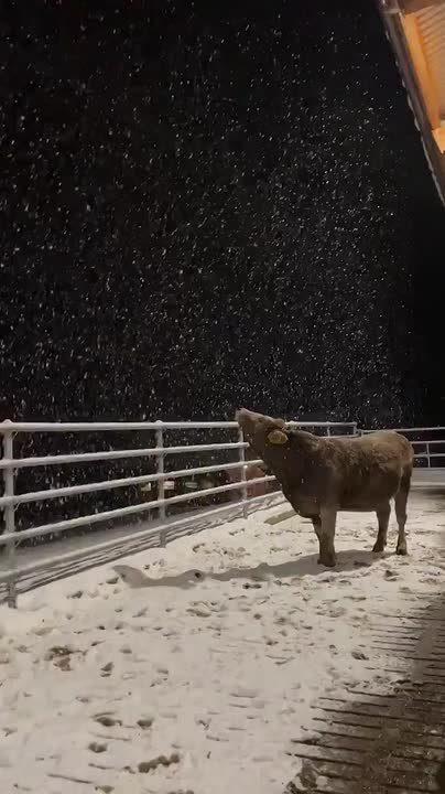 Корова впервые увидела снег — и это мгновение покорило соцсети. Животное пытается понять, что вообще происходит, и ловит снежинки ртом.