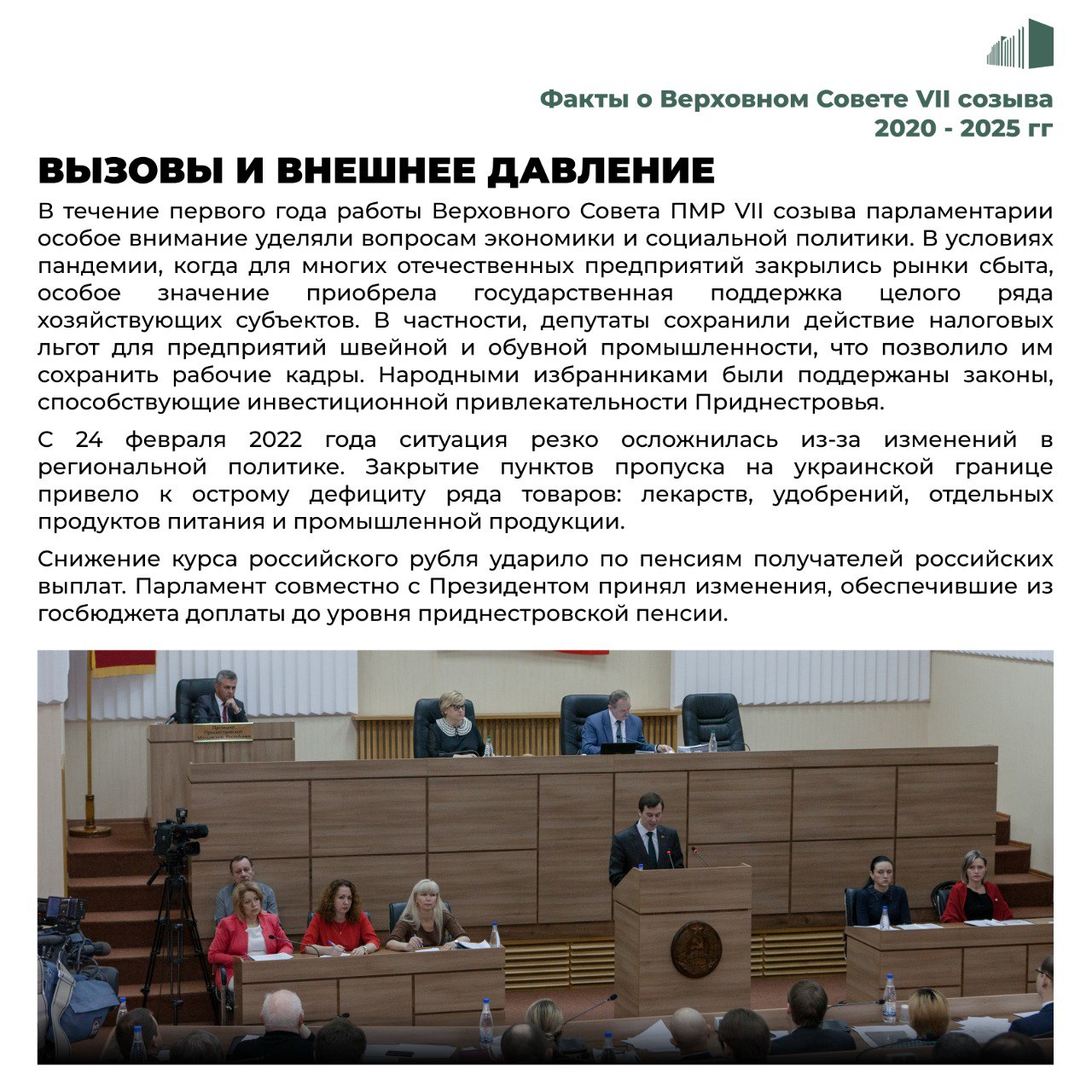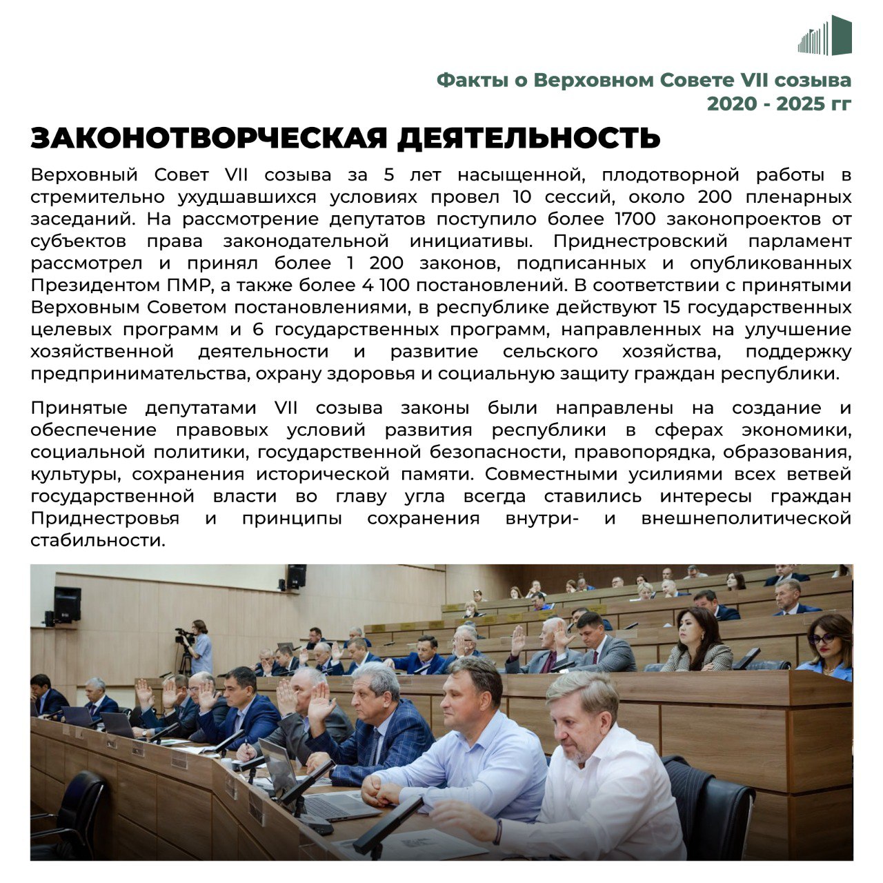 Период работы этого парламента пришелся на время серьезных вызовов для республики: пандемии, внешнеполитического давления, экономических ограничений и энергетического кризиса. Несмотря на это, депутаты обеспечили стабильную законодательную работу, усилили взаимодействие с ключевыми международными партнерами, поддержали социальную сферу и приняли решения, направленные на защиту прав и интересов жителей Приднестровья.