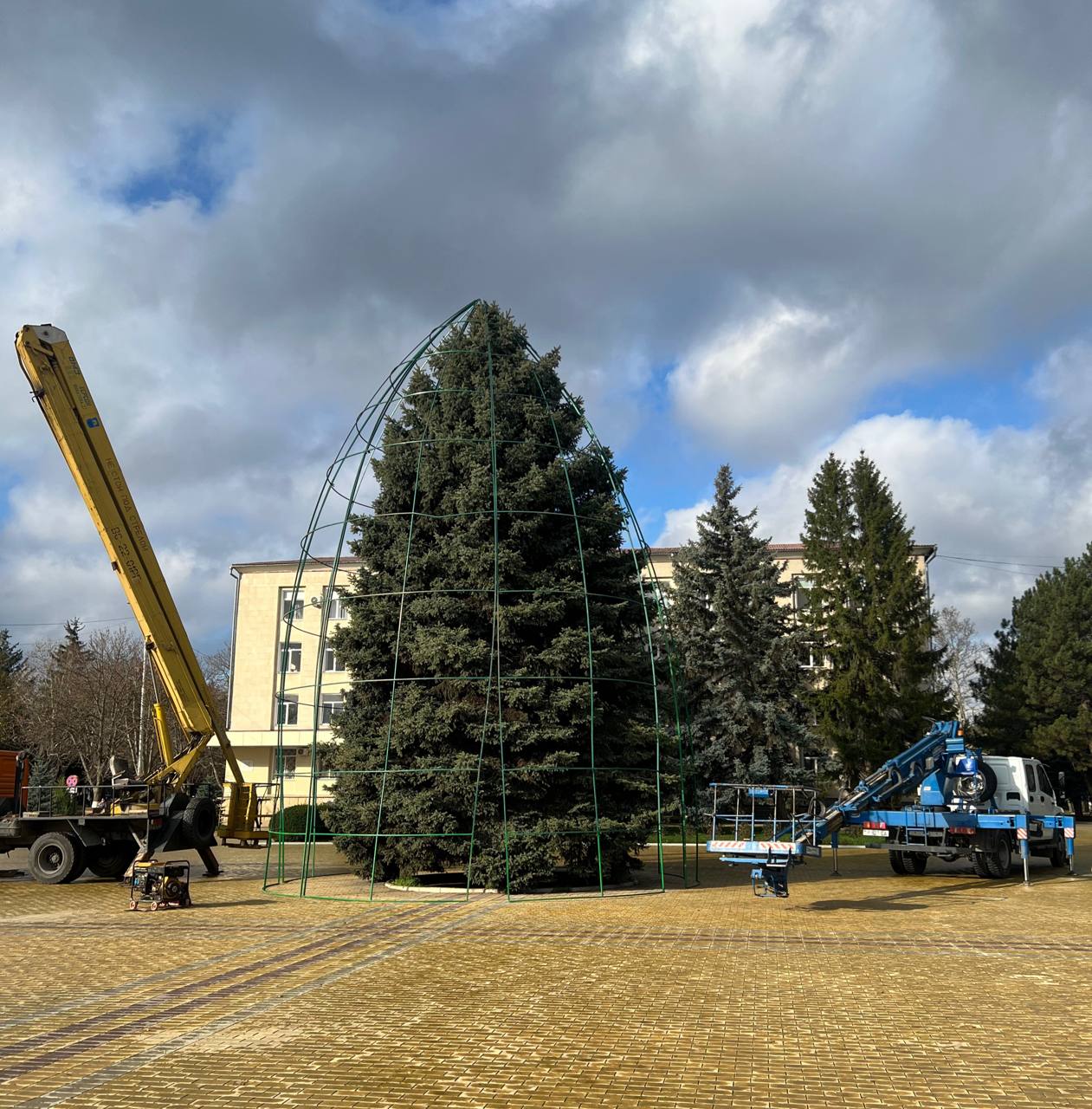 На городской площади устанавливают главную ёлку. Конструкция уже собрана частично, специалисты продолжают монтаж. Рядом появляются световые фигуры и праздничные декорации.