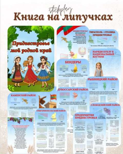 «Приднестровье – мой родной край»: флаг и герб, карта с районами и достопримечательностями, национальная одежда и кухня (с помощью липучек, например, можно «одевать» персонажей и «готовить» блюда).