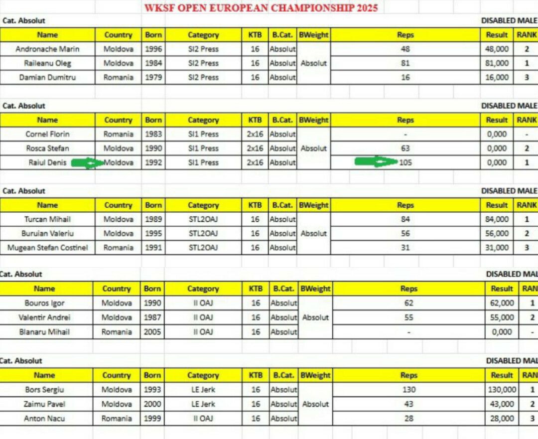Была также специальная номинация для параспортсменов, где выступали только гиревики из Молдавии и Румынии. Они участвовали в пяти категориях, которые различались по типу упражнений. 5 молдавский параспортсменов стали чемпионами, в том числе и Денис Раюл.