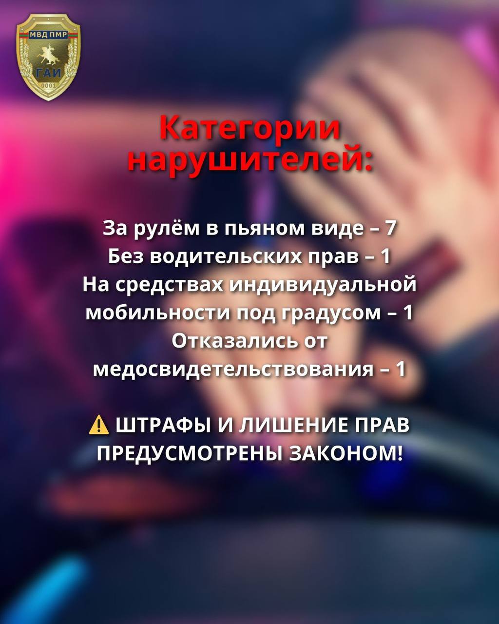 Семь пьяных водителей привлечены к админответственности по п. 1 ст. 12.8 КоАП ПМР. Они заплатят штраф, размер которого может достичь 3680 рублей ПМР, и будут лишены водительских прав на срок до двух лет.