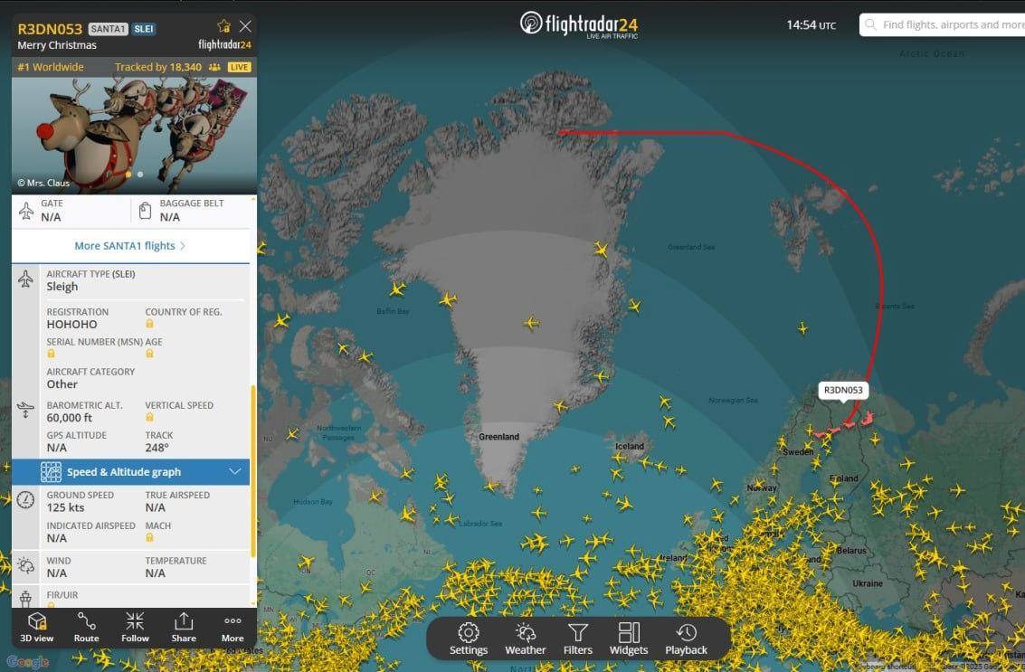 Сани с упряжкой оленей Санта-Клауса вылетели из Северного полюса и уже отправились в полет вокруг Земли.