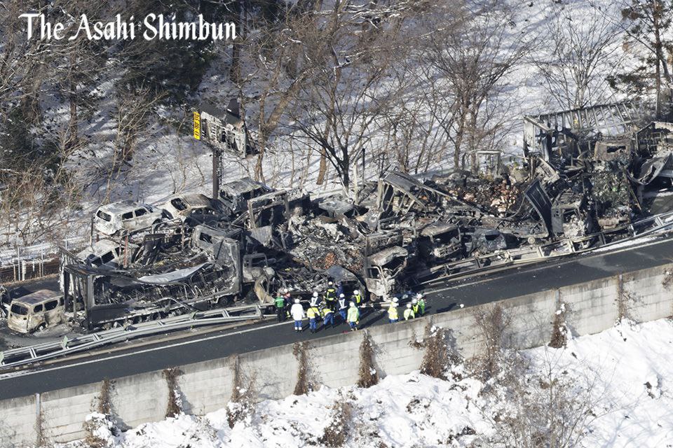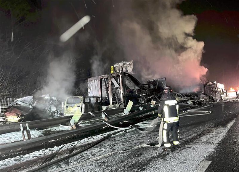 Вначале занесло на дороге большой грузовик, затем в него врезались 55 легковых машин. На месте ДТП начался пожар.Один человек погиб, 26 – получили травмы.